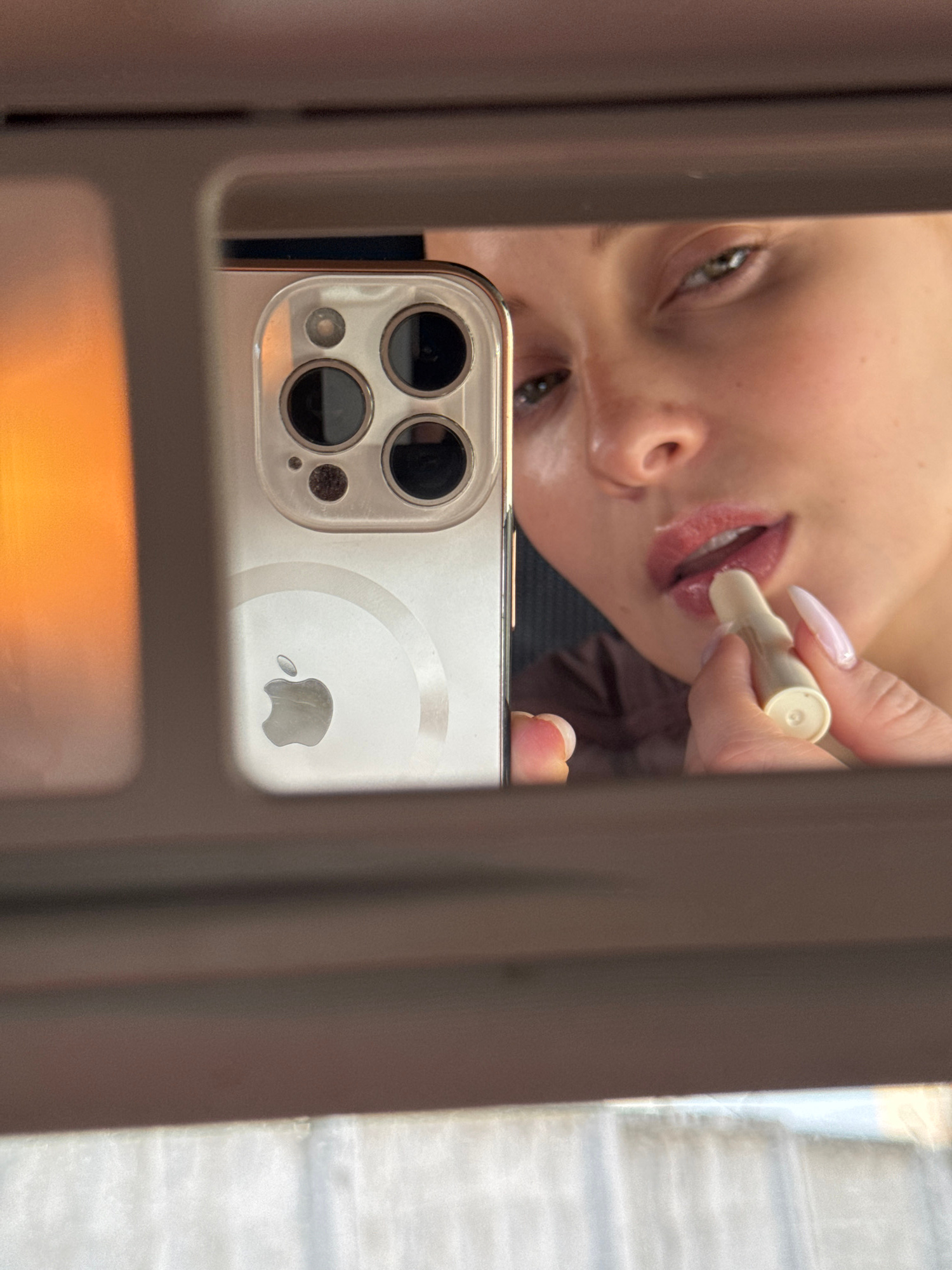 The image is a selfie taken in a mirror using an iPhone. The phone is a gold/white color and features a prominent Apple logo. The camera lenses are visible. The reflection shows a person applying lip…read more