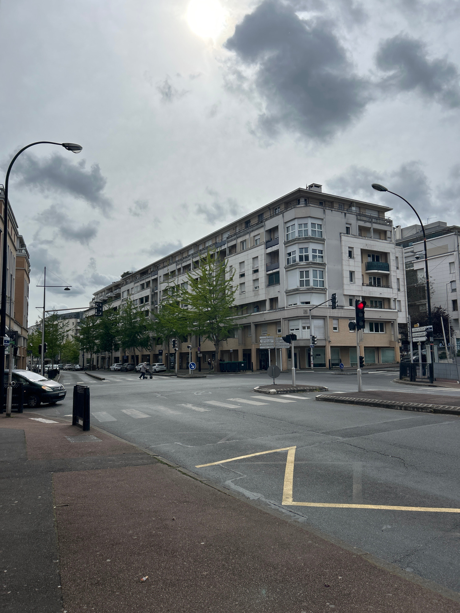 The image depicts a street scene in Cachan, France, under an overcast sky. The street is wet, suggesting recent rain. A tall, multi-story building with a light gray facade dominates the left side of t…read more