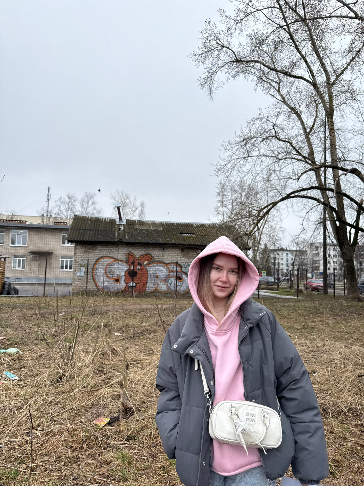 A young woman wearing a pink hooded sweatshirt under a gray puffer jacket and carrying a white purse stands in a grassy field. The background includes a weathered, two-story building with a graffiti m…read more