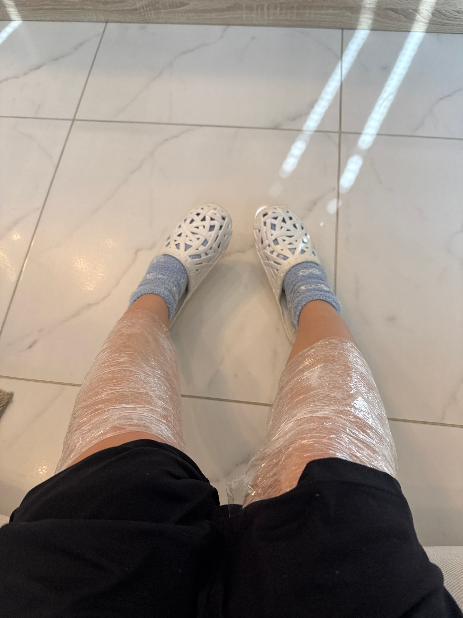 The image displays a first-person, downward view of an individual's lower body within an indoor setting. The subject wears black shorts, light blue socks, and white, latticed slip-on shoes. Both lower…read more