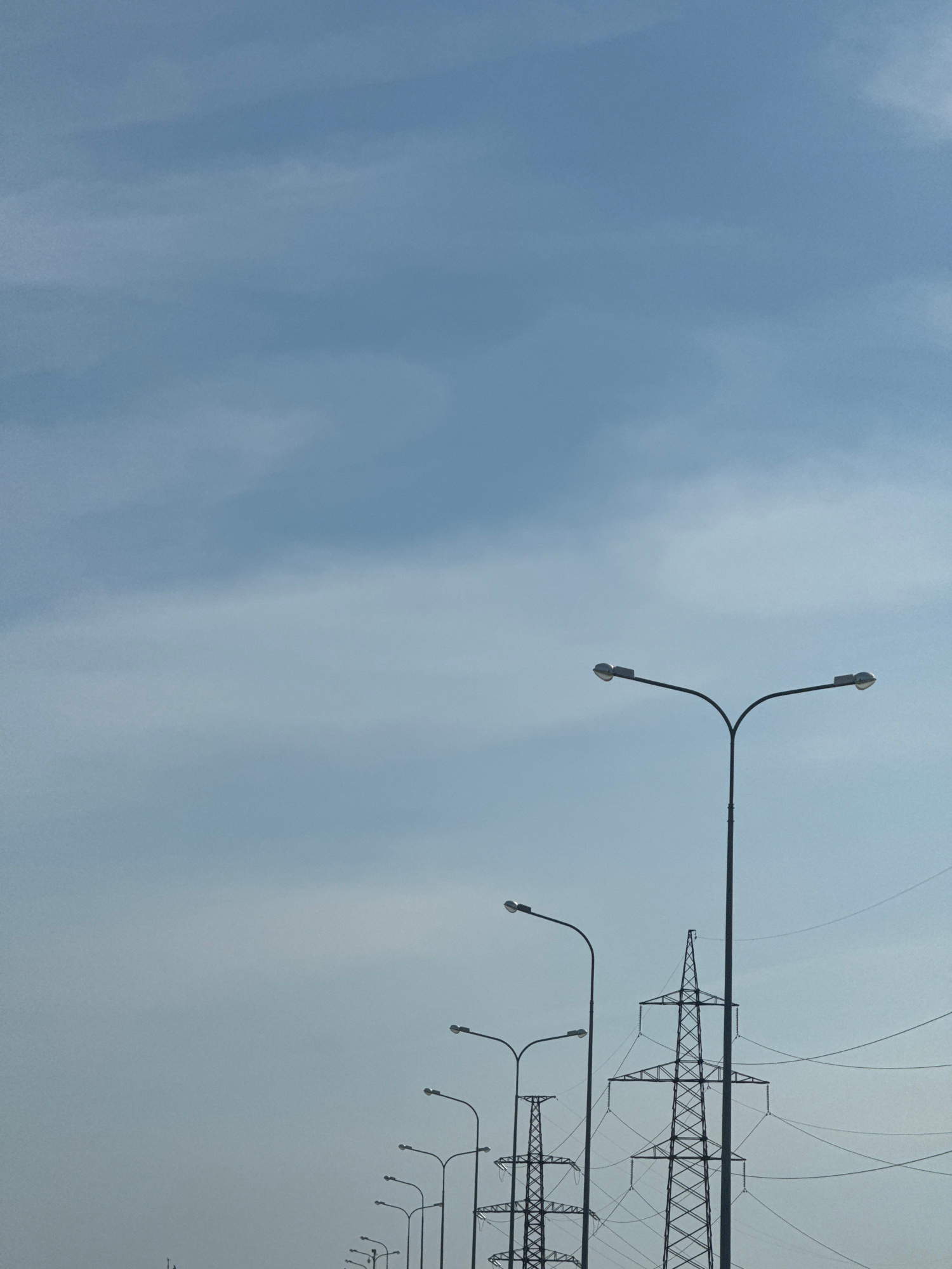 The image depicts a row of streetlights and power lines against a light blue sky. The lights are situated along a road or highway, receding into the distance. The power lines, supported by metal tower…read more