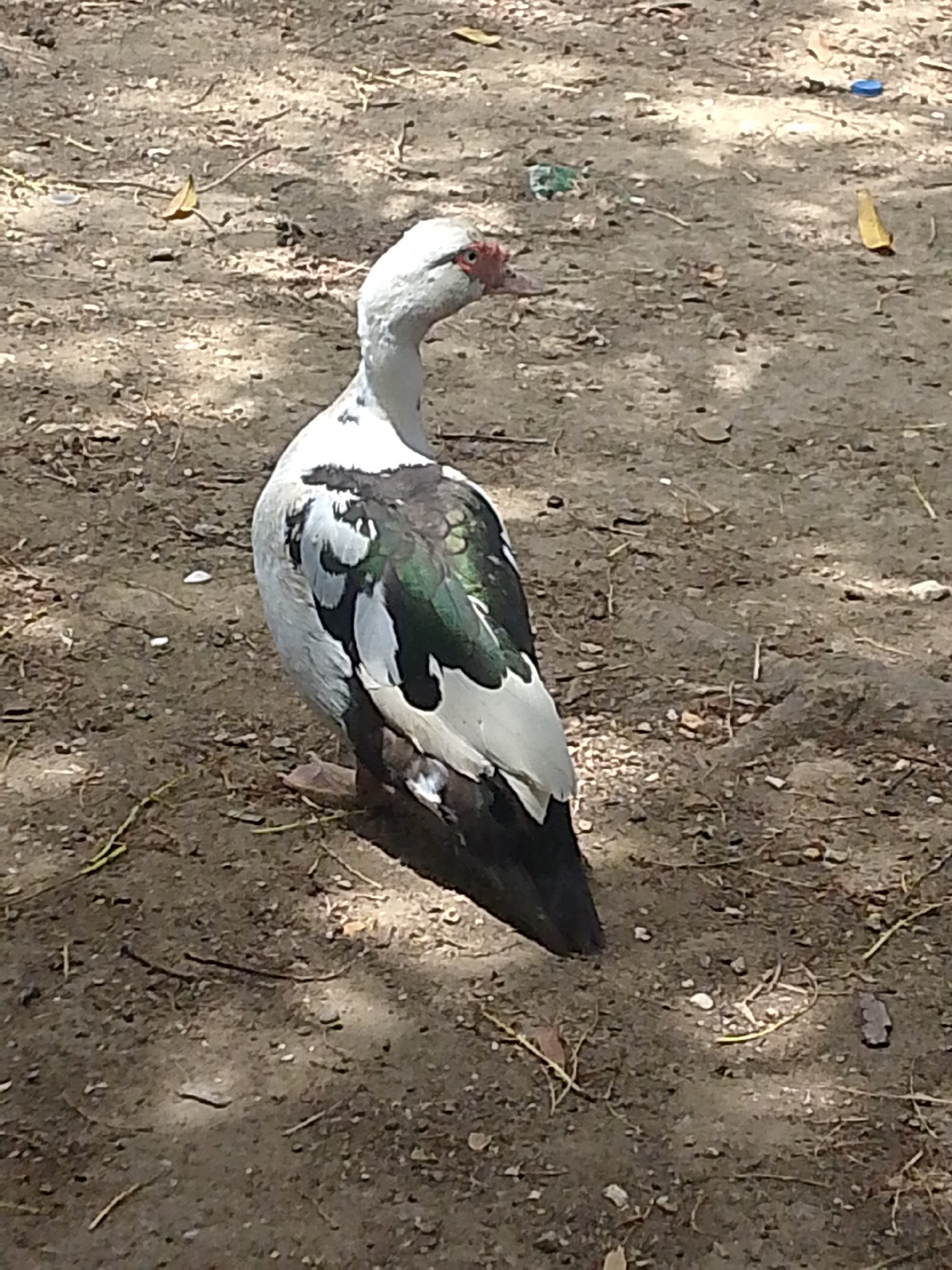 A Muscovy duck stands on dirt ground. The duck is white with black and green markings. The location is likely in the city of Juan Griego, Venezuela.