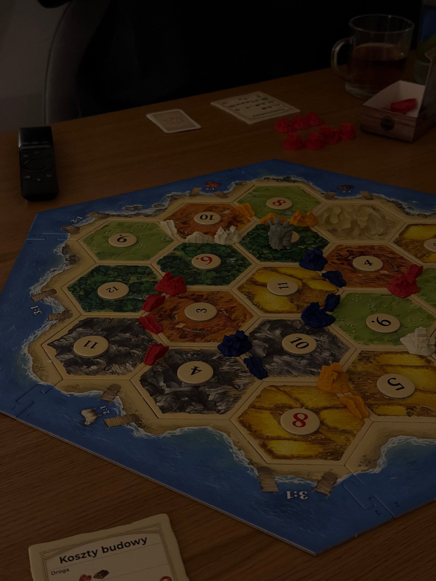 The image shows a partially completed board game, Catan, on a wooden surface. Game components such as hexagonal resource tiles with numbered tokens, player pieces (roads and settlements in red, blue,…read more