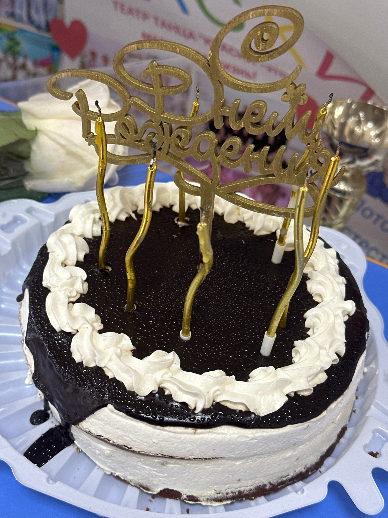 A chocolate cake decorated with white frosting and a golden "Happy Birthday" topper sits on a white plastic tray, likely in Votkinsk, Russia, indicated by lettering on a partial background item. The c…read more