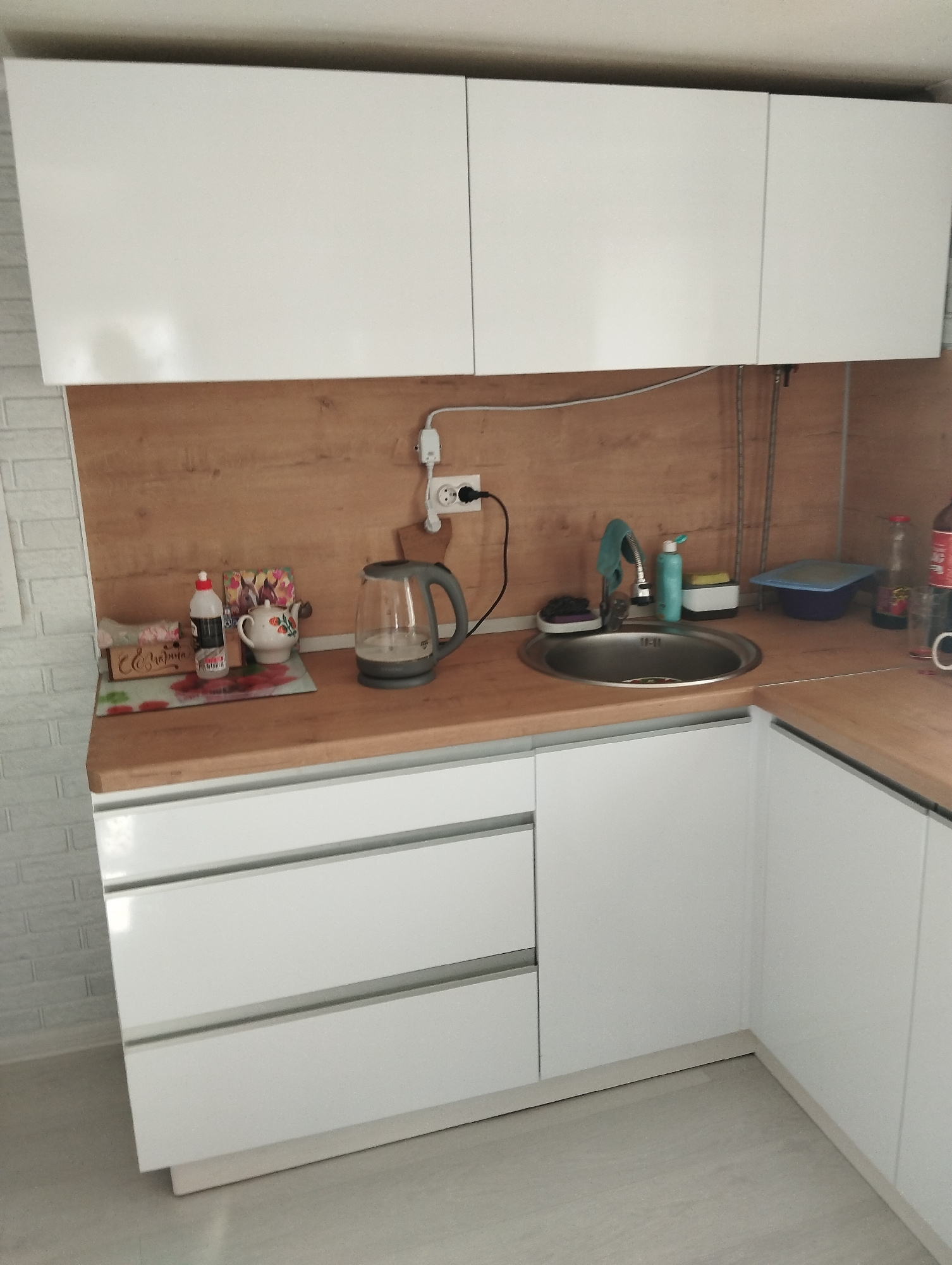 A kitchen scene featuring white cabinets and drawers, a wooden countertop with a sink, a kettle, cleaning supplies, and food items. The backsplash is also wooden. A power outlet with a plugged-in kett…read more