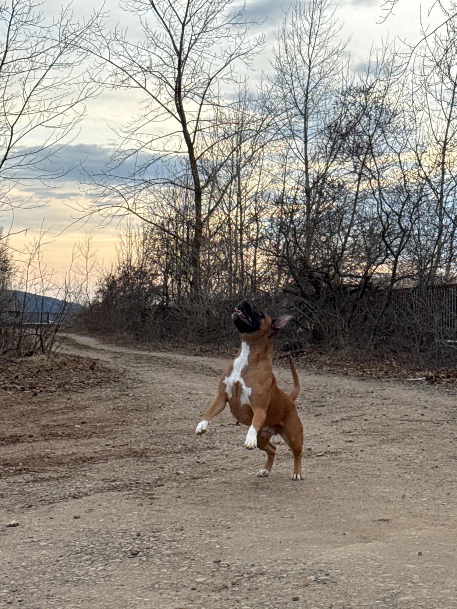 A medium-sized, brown and white dog is running diagonally across a dirt path. The dog has its mouth open and appears to be in motion. The path is lined with bare trees and shrubs on the left side of t…read more