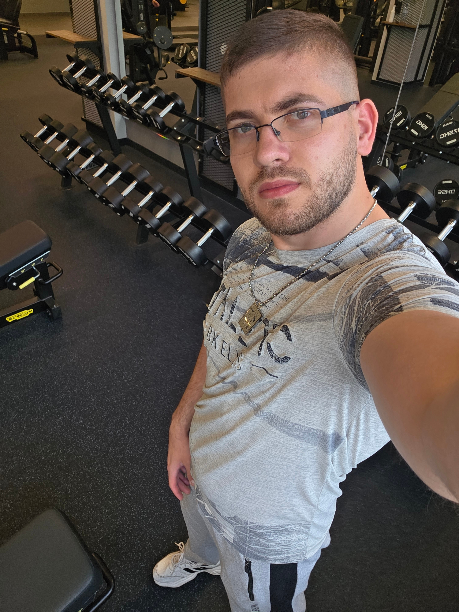 A man is taking a selfie inside a gym. The man has short brown hair, a beard, and is wearing glasses. He is wearing a gray t-shirt and gray sweatpants with black stripes. He has a silver chain with a…read more