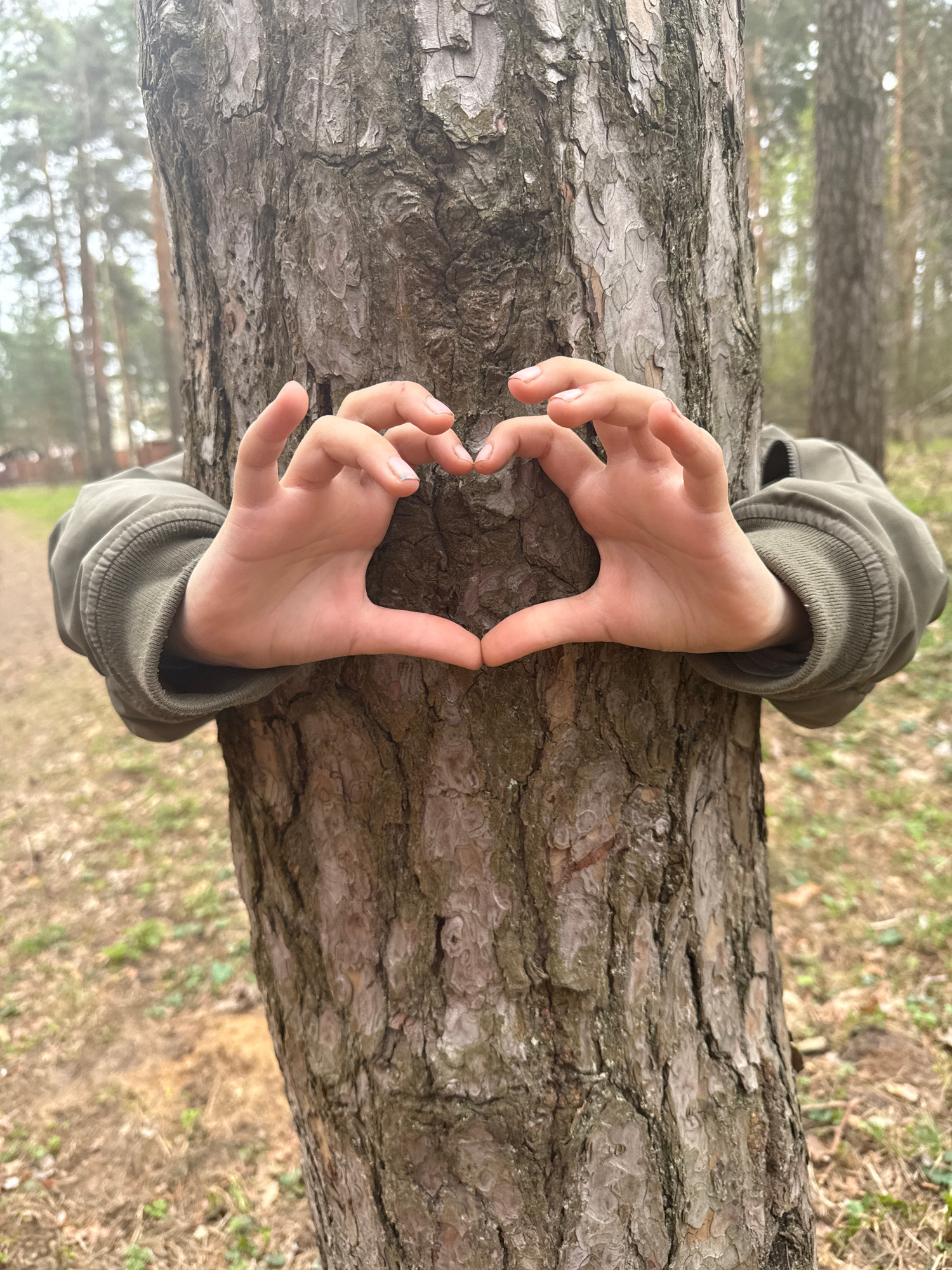 A close-up photograph, presented with a horizontal orientation, captures two fair-skinned human hands forming a heart shape around a prominent tree trunk. The hands, likely belonging to a child or you…read more