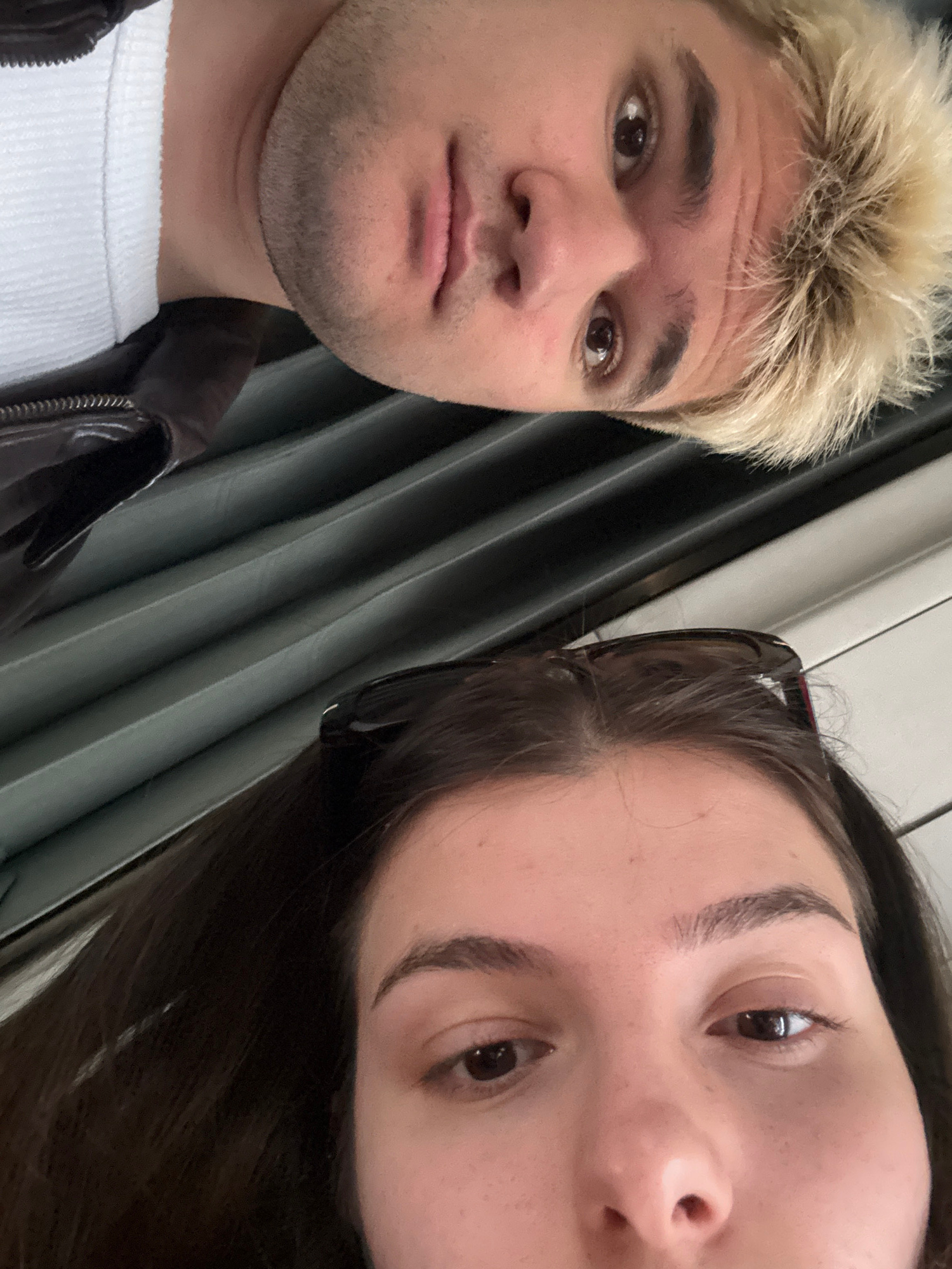 A selfie shot of two individuals, a male and a female, possibly taken indoors. The male, positioned on the left, has short, bleached blond hair, light skin, and is wearing a white ribbed undershirt an…read more