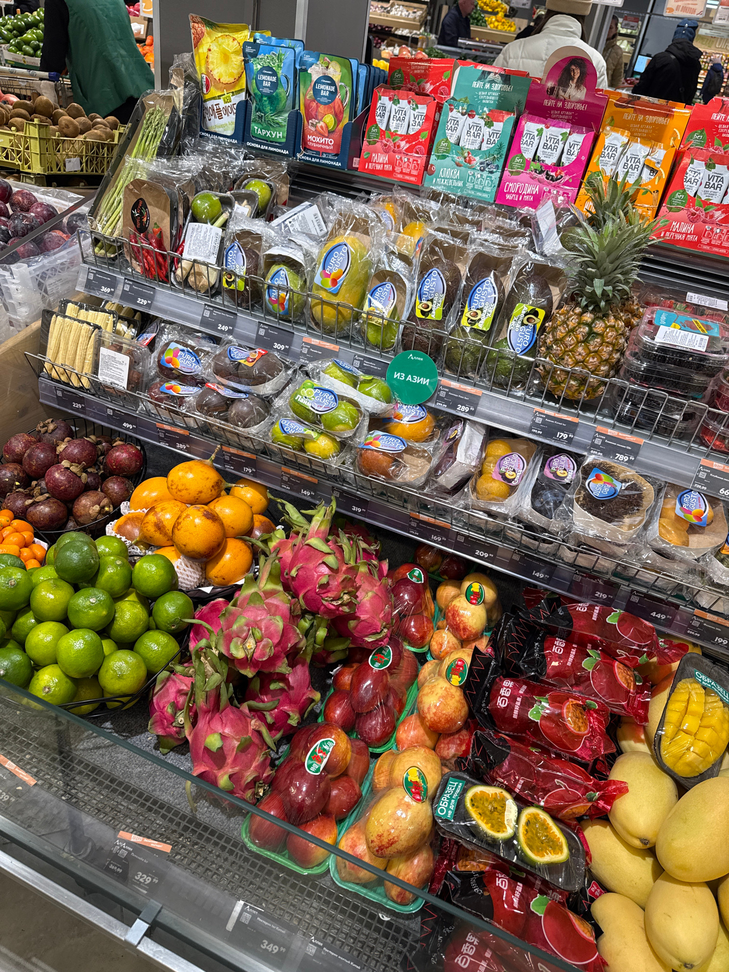 This image captures a vibrant and well-stocked produce section in a supermarket, likely in Krasnoyarsk, Russia, given the contextual information and visible Russian text. The display is brightly lit,…read more