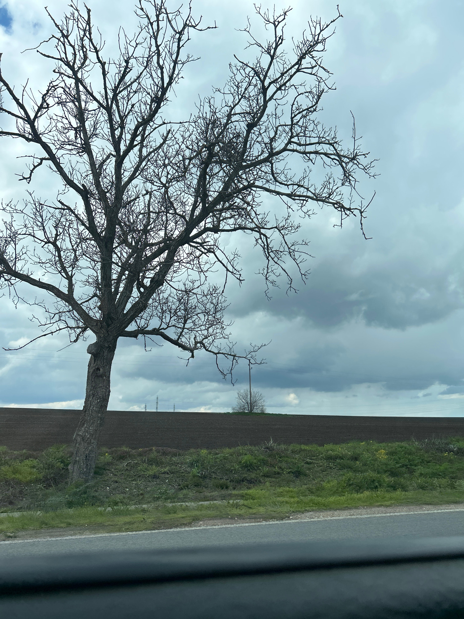 The image depicts a tree without leaves, likely during the late fall or winter season, standing beside a rural road. To the right of the road is a plowed field transitioning into a grassy verge. In th…read more