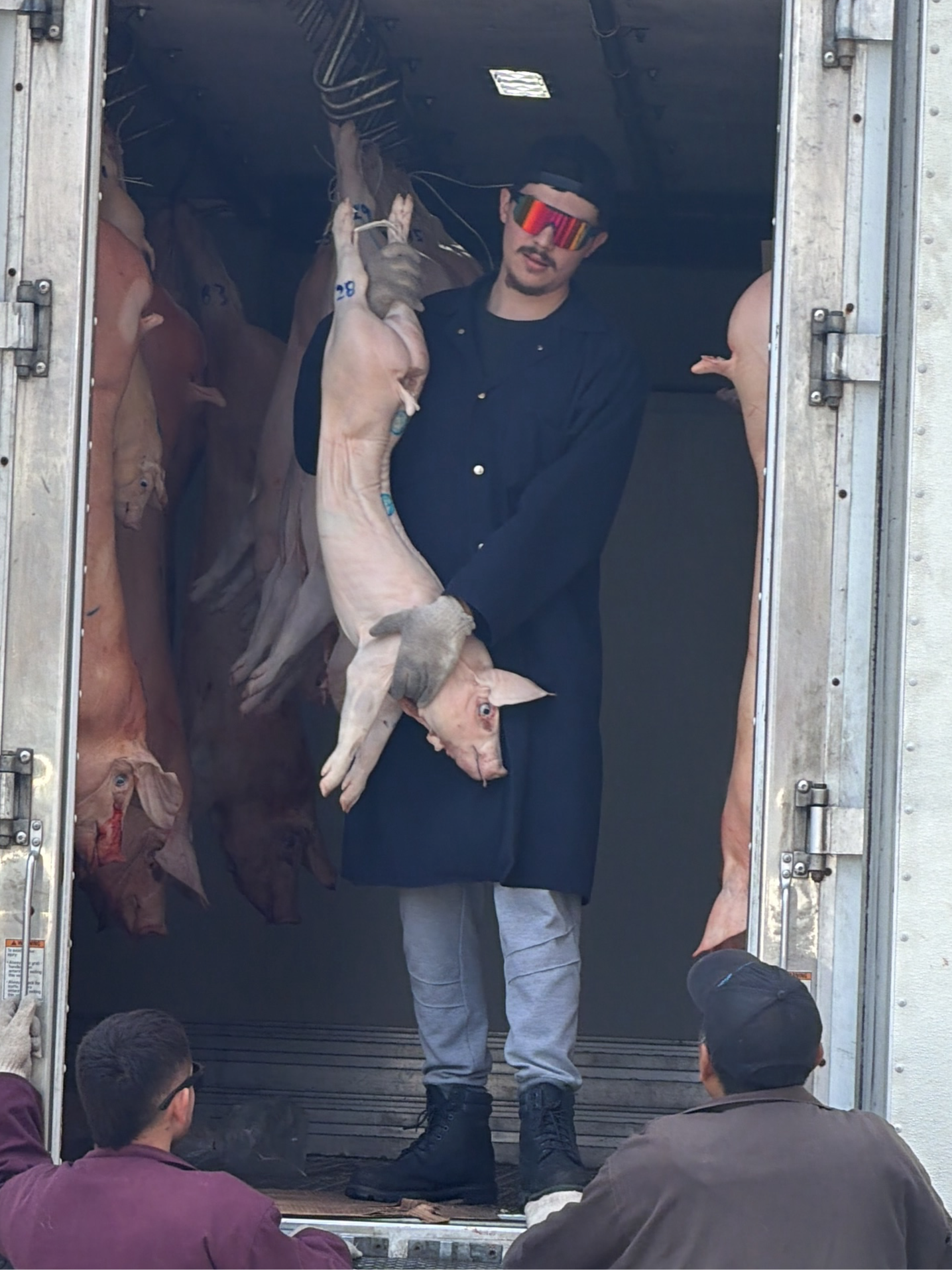 This image depicts a scene of commercial meat handling occurring at the rear opening of a large, light-colored metal truck or trailer in New York, United States. Inside the truck, a male individual s…read more