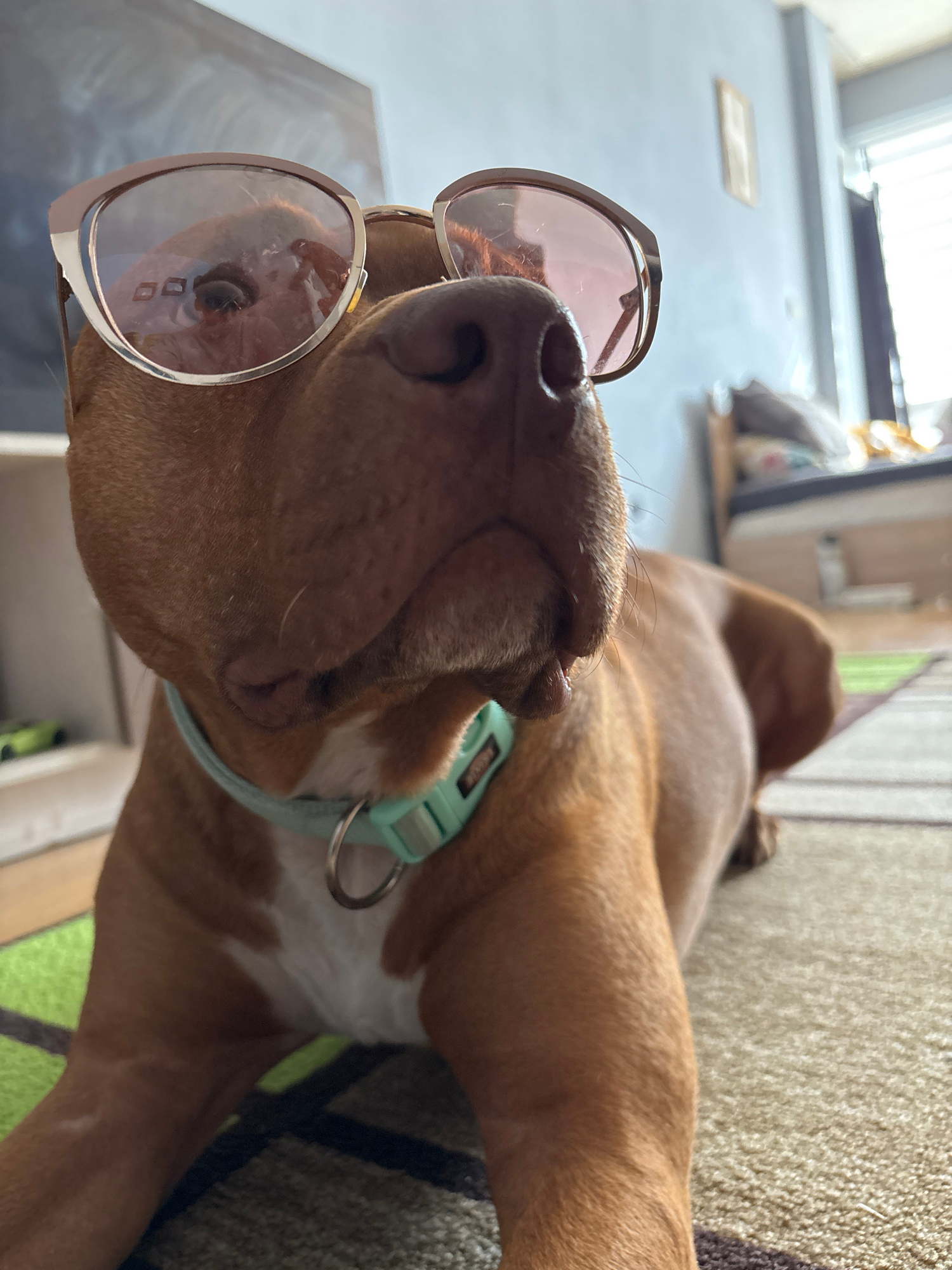 An upward-facing, low-angle close-up captures a light brown dog, possibly a pit bull mix, lying on its back or side on a textured rug in an indoor setting in Sofia, Bulgaria. The dog has short, reddis…read more
