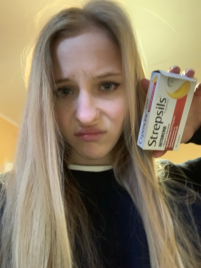 A young woman with long blonde hair is shown in an angled selfie. She holds a box of Strepsils throat lozenges over her head. She is wearing a dark top with a white collar. Her facial expression is sl…read more