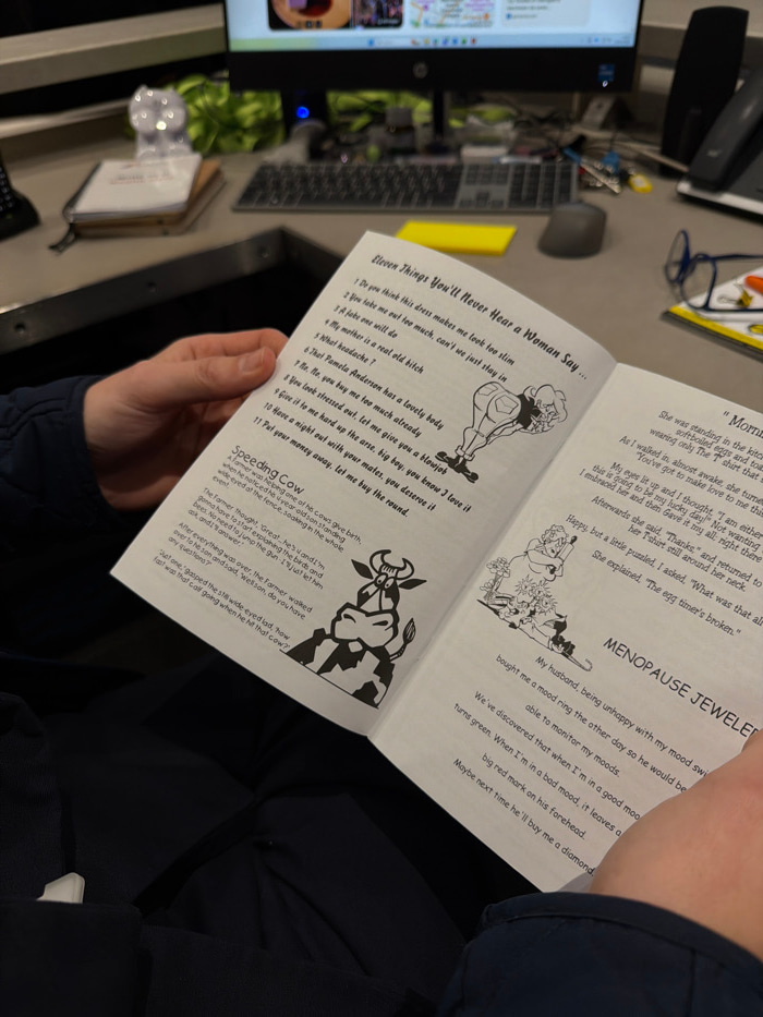 The image shows a humorous pamphlet opened to two pages. One side features a list titled "Eleven Things You'll Never Hear a Woman Say," including phrases like "Do you think this dress makes me look to…read more