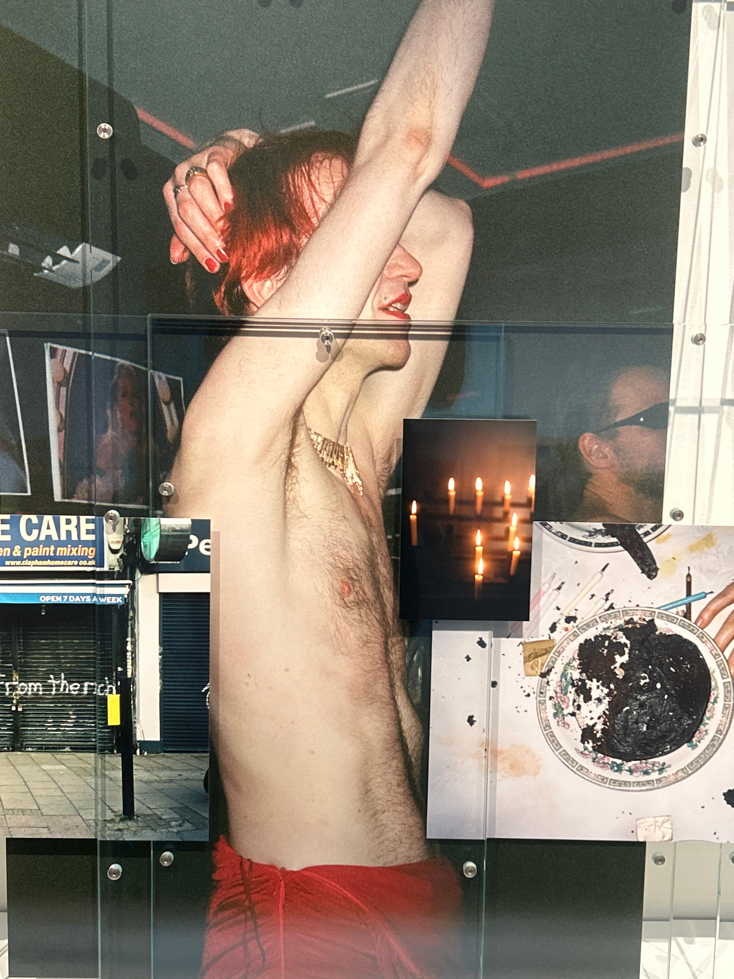 The image is a layered collage of photographs and prints affixed to a transparent surface, possibly acrylic or glass, held together by bolts. A central, horizontally-oriented photograph depicts a pal…read more