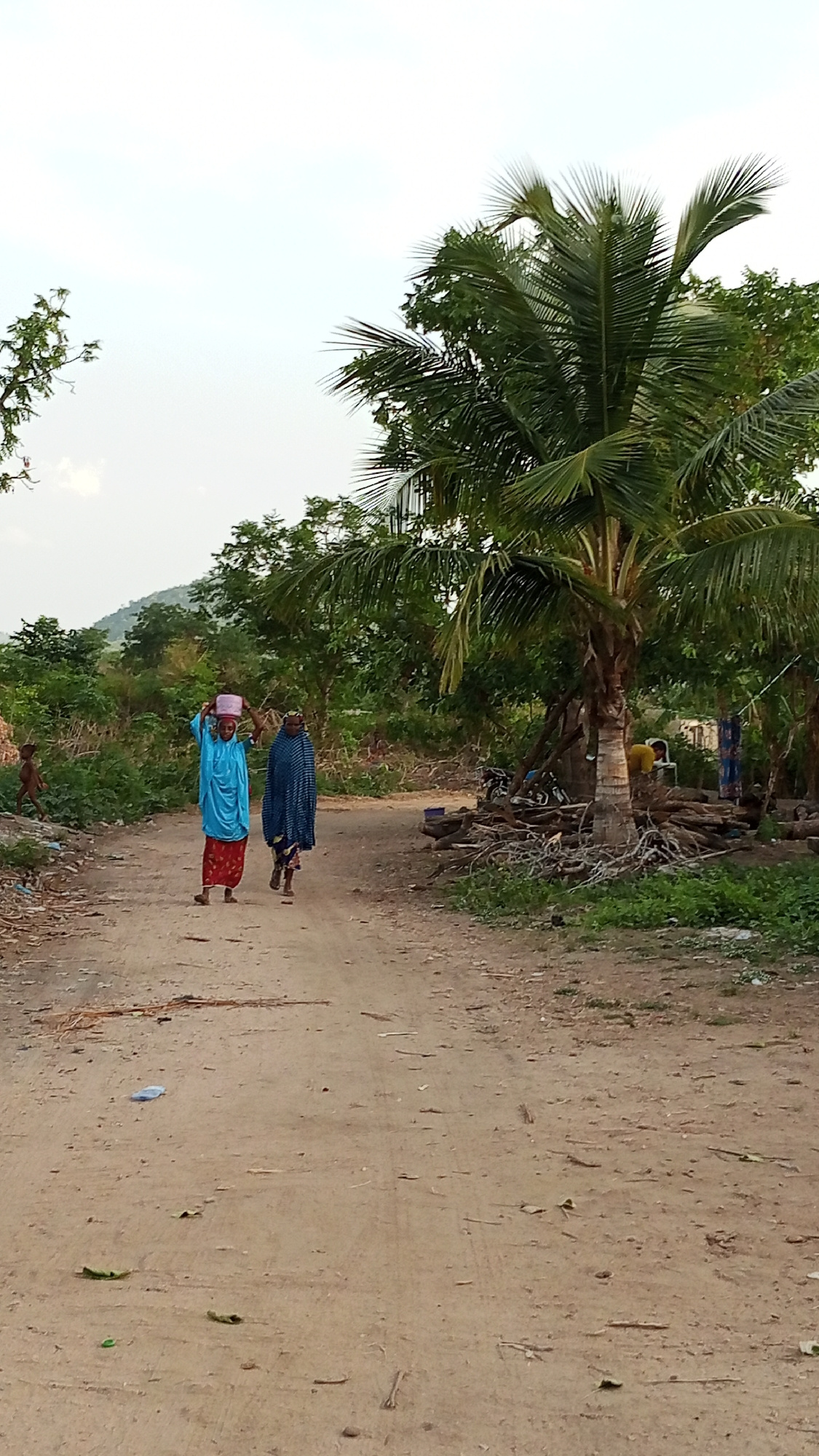 Two women walk on a dirt road in Adankolo, Nigeria. One woman wears a blue dress and red skirt and carries a pink bucket on her head. The other woman wears a blue patterned shawl. To the right of the…read more