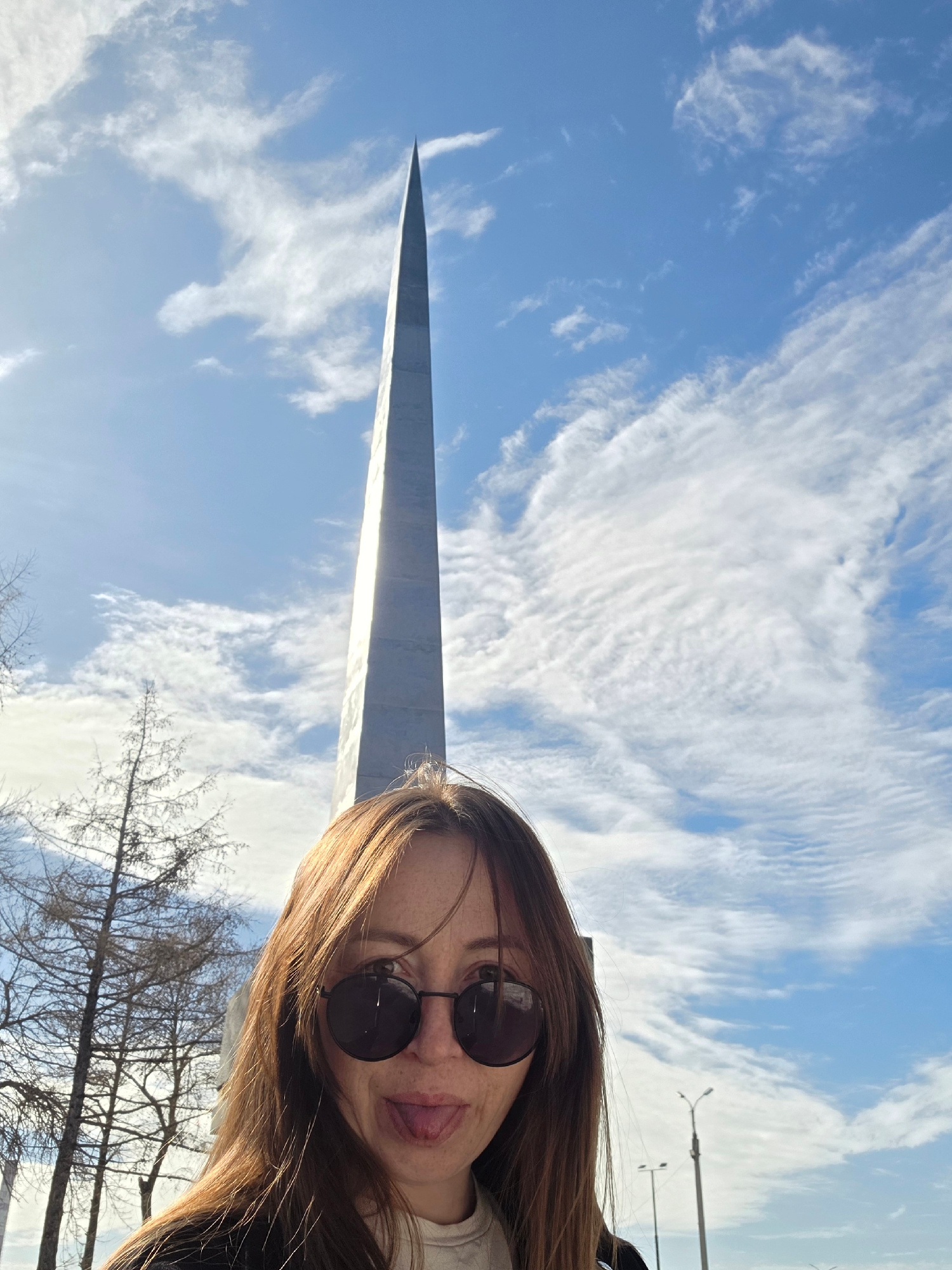 An outdoor photograph captures a female individual in the foreground, facing the camera and partially obscuring the lower section of a monument. She has long, light brown hair, wears round, dark-tinte…read more