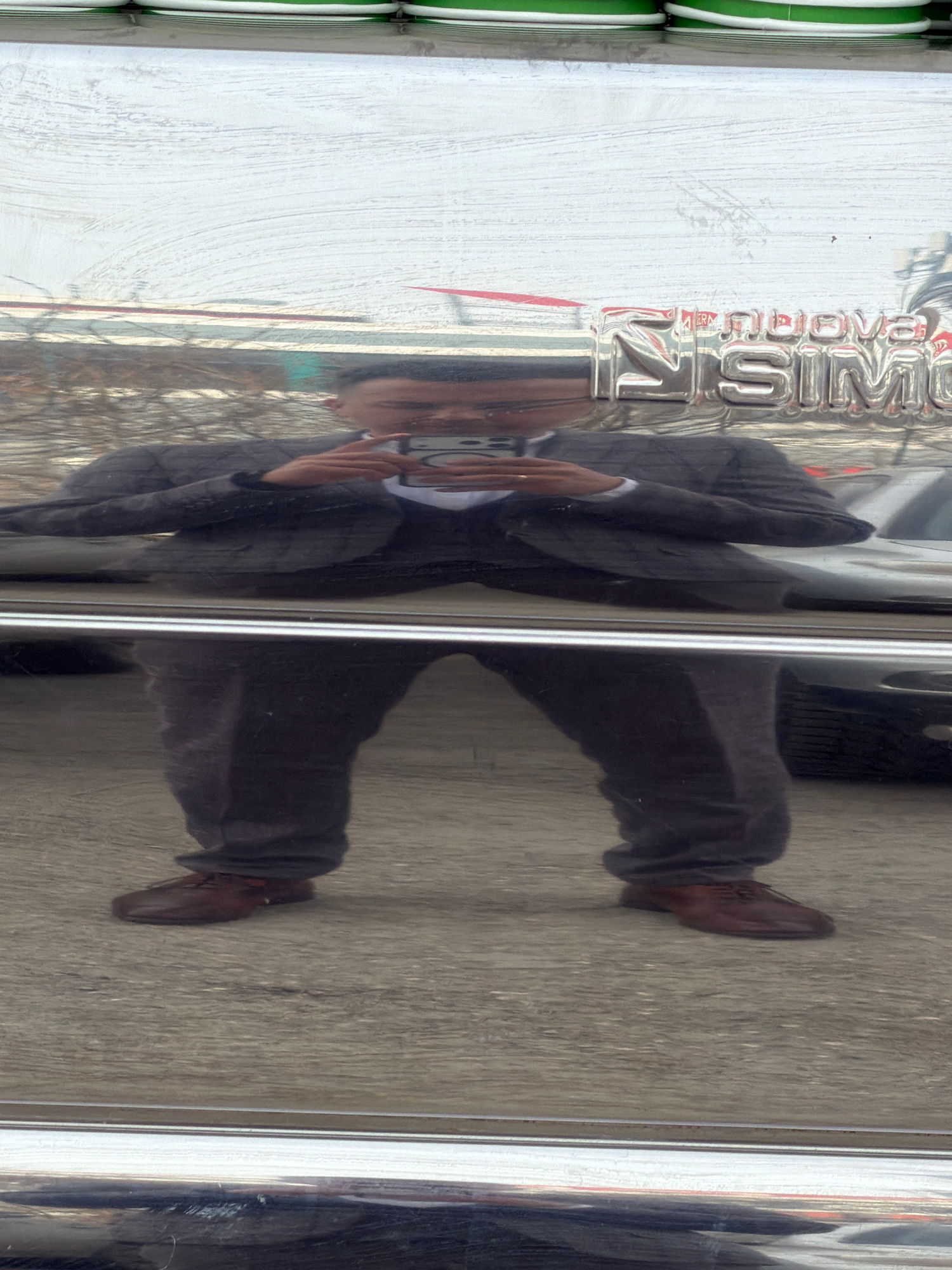 Reflection of a man taking a photo with his phone on a shiny surface with the text "PERM CITY" on the upper left. The man is wearing a suit jacket, dress pants, and brown dress shoes. The background a…read more