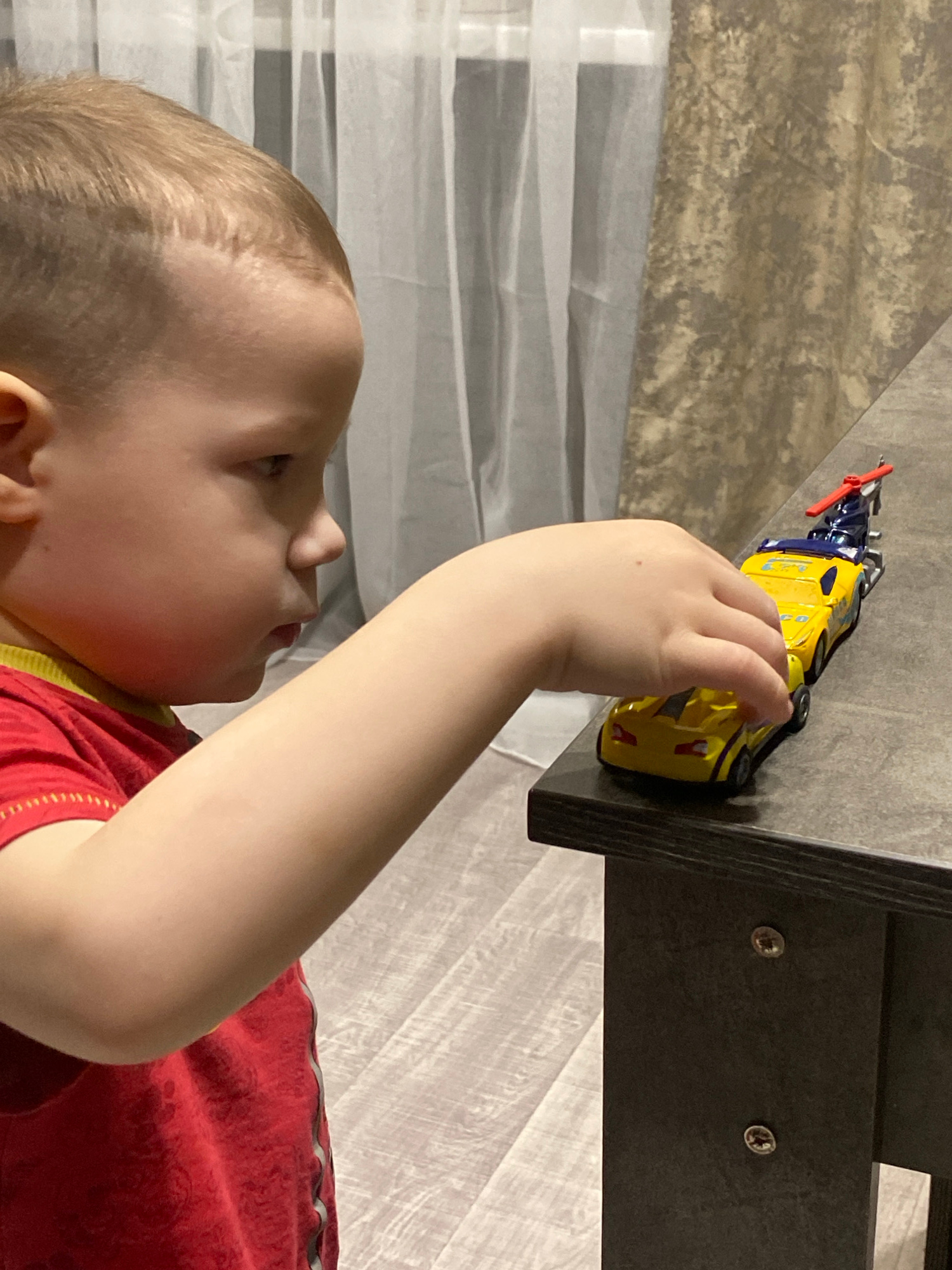 An indoor scene depicts a young child, visible in profile from the chest up, facing right. The child has short, light-colored hair and wears a red t-shirt with a yellow collar trim and yellow stitchin…read more
