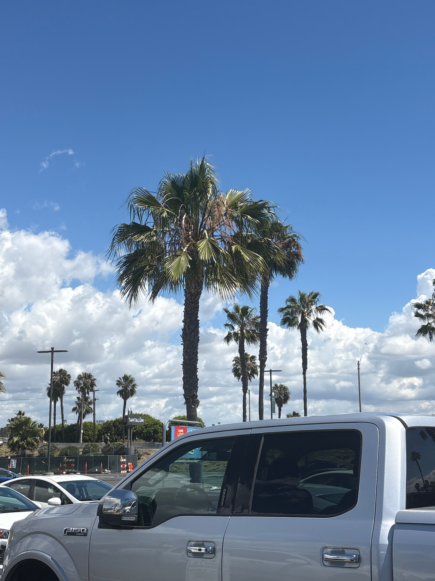 The image shows a sunny day in Long Beach, California, United States of America. Several palm trees are visible against a backdrop of fluffy white clouds and a blue sky. The view is partially obstruct…read more