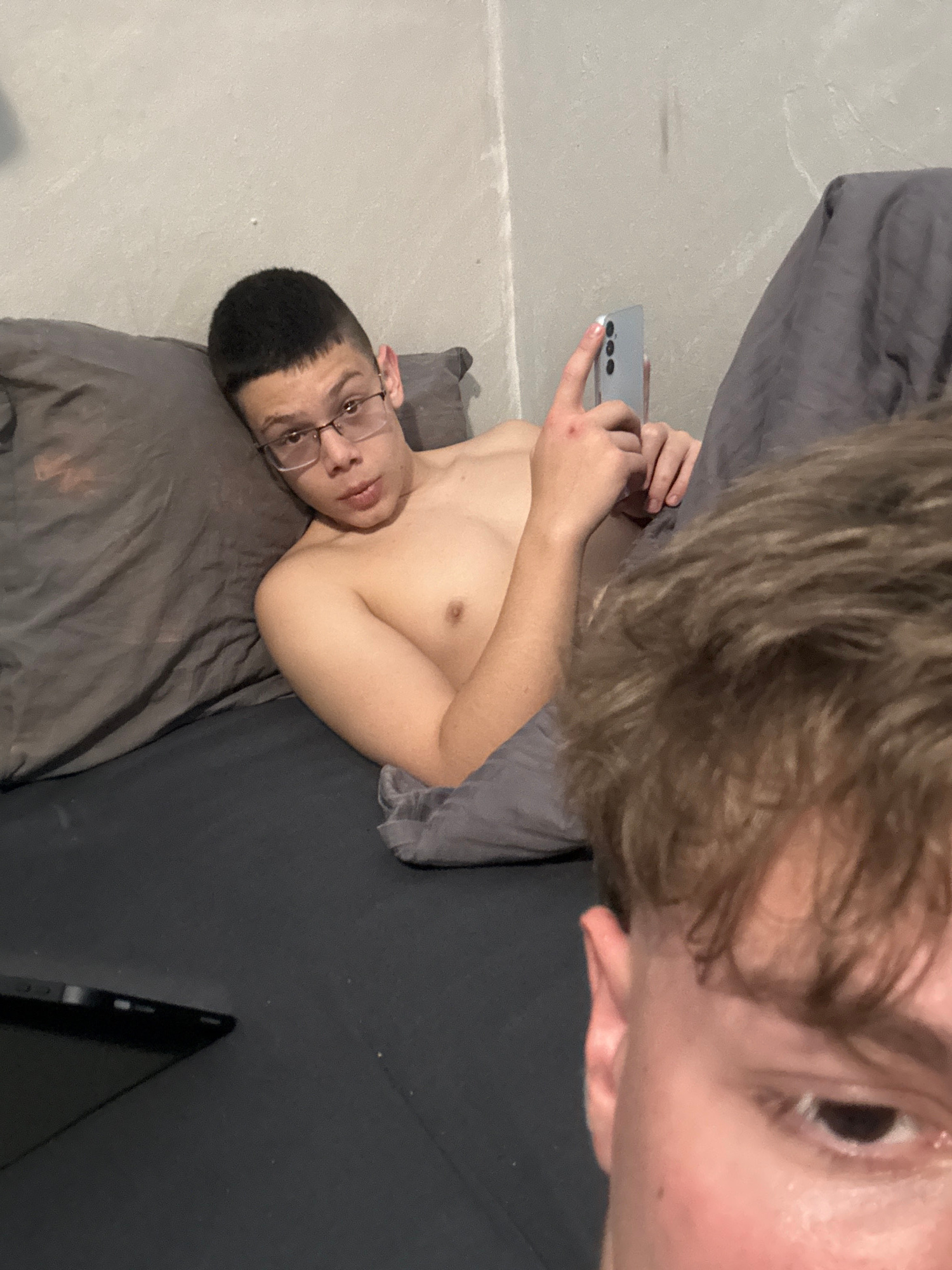 The image depicts two individuals lying on a bed. The person in the foreground is close to the camera, with their face and hair visible. The second individual is lying on their back, wearing glasses,…read more