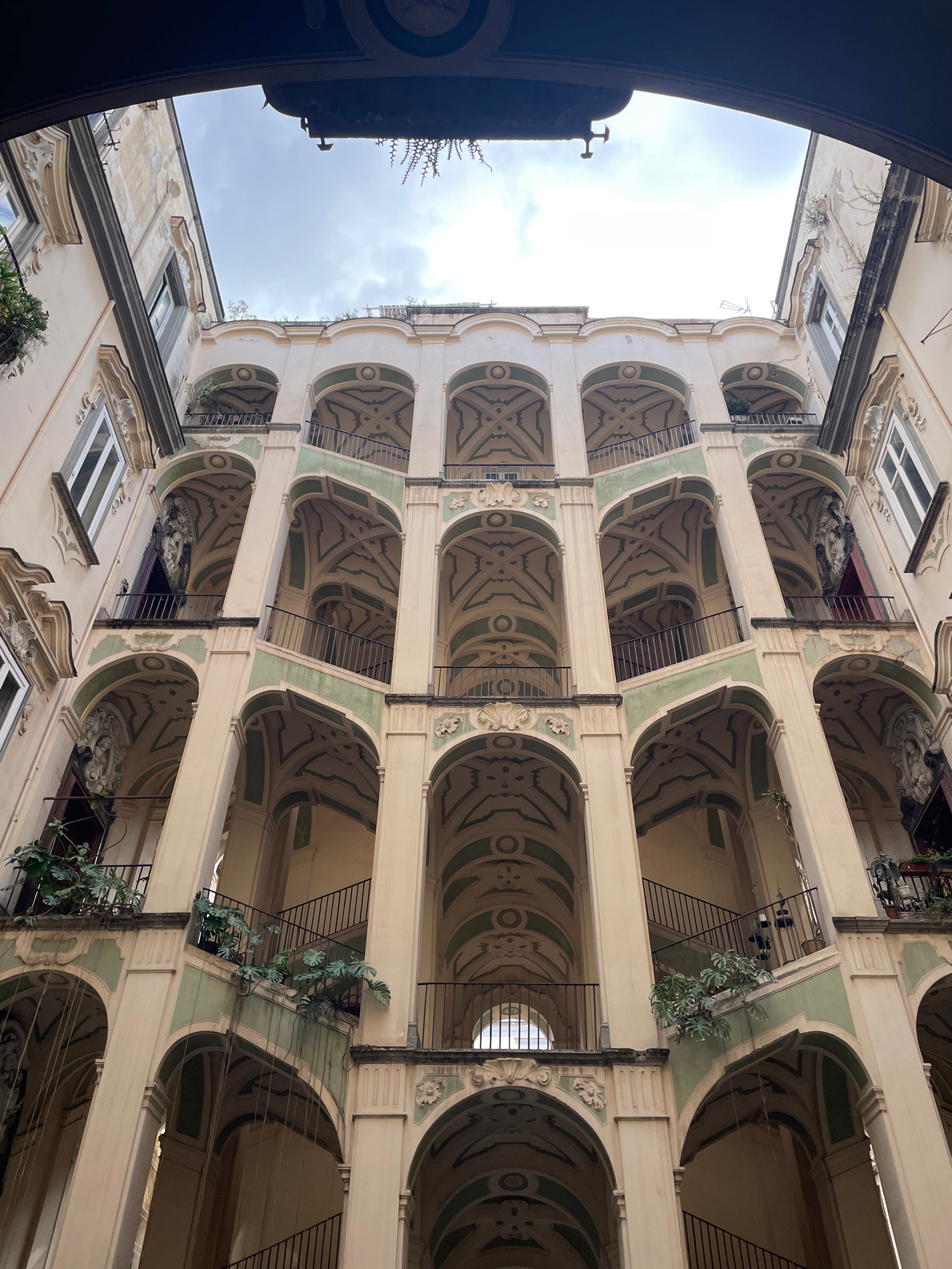The image displays an upward-looking view from within the central courtyard of the Palazzo dello Spagnolo in the Rione Sanità district of Naples, Italy. The scene is dominated by a multi-tiered, symme…read more