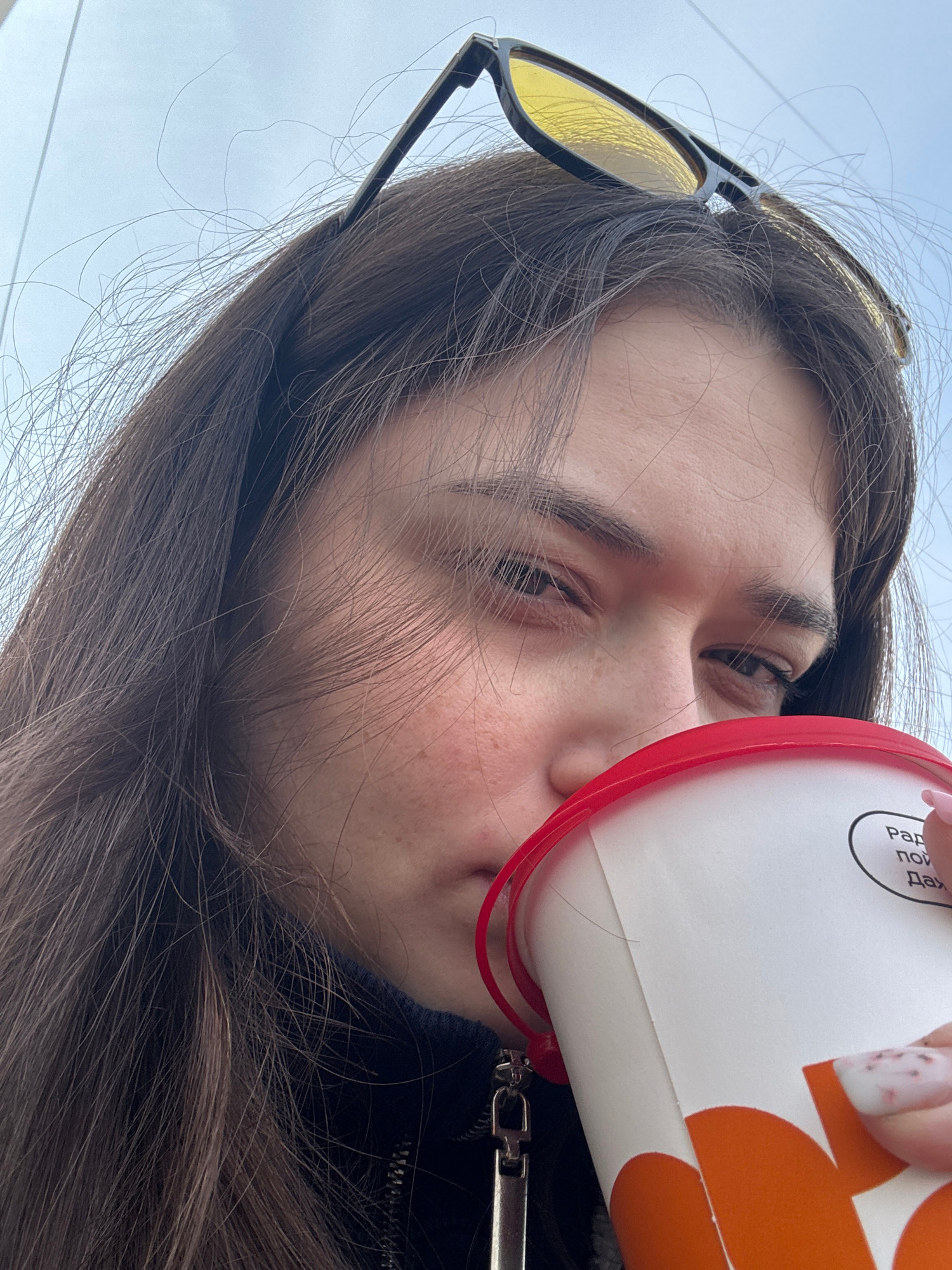 A woman with brown hair is drinking from a white and orange cup with a red lid. She is wearing sunglasses. The location is Chaikovsky, Russia, as indicated by the Russian text on the cup. The backgrou…read more