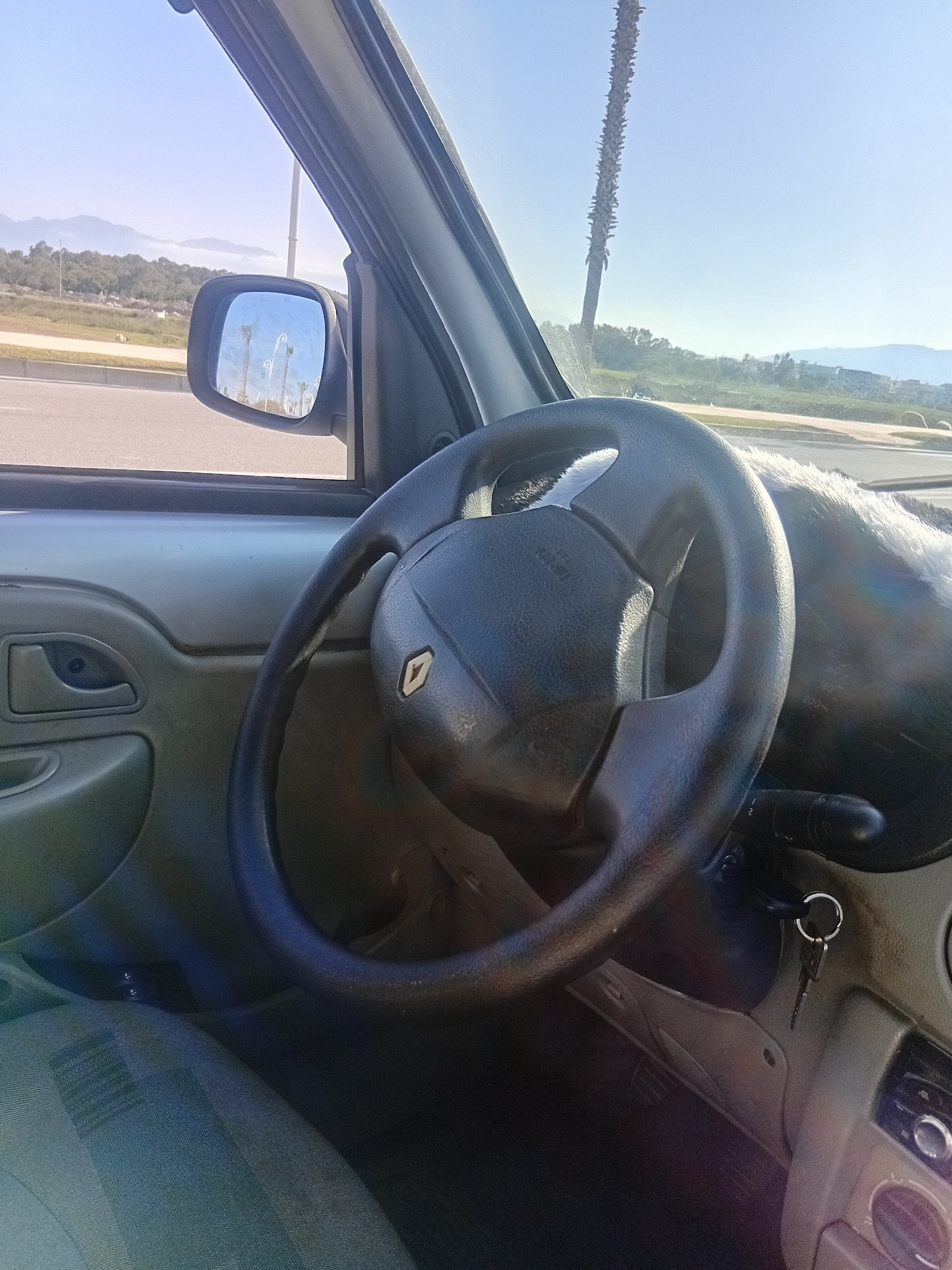 The image shows the interior of a Renault vehicle, focusing on the steering wheel with the Renault logo. The keys are in the ignition. The side mirror shows a view of a road with palm trees, suggestin…read more