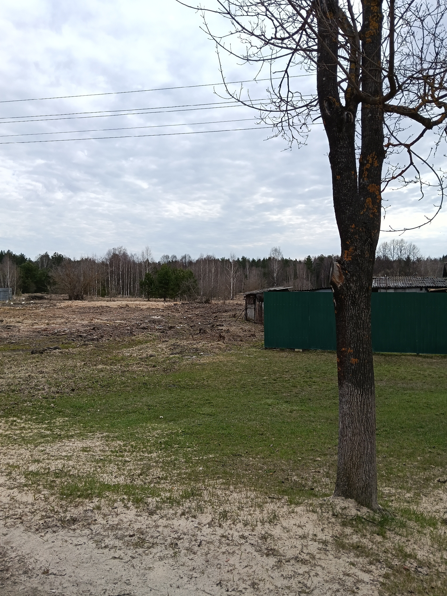 The image depicts a rural scene in Красный Маяк, Russia, with a prominent tree trunk in the foreground. The ground transitions from sandy patches to green grass. A cleared area with exposed soil and s…read more