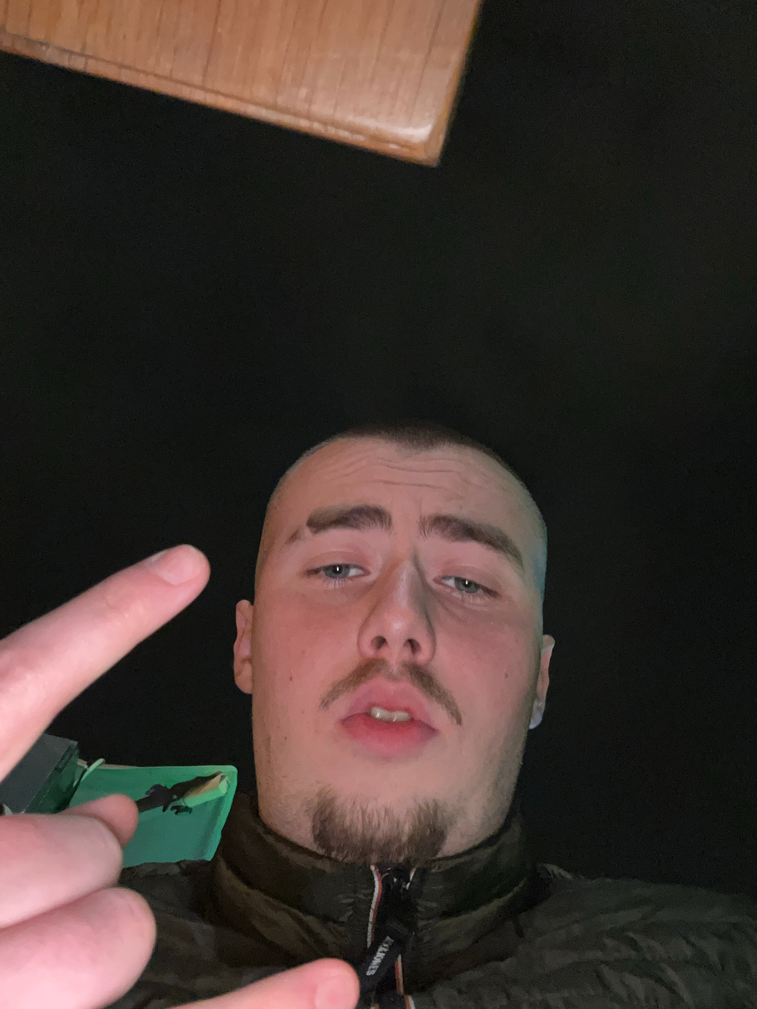 The image shows a man with short, light brown hair and a beard looking down at the camera. He is wearing a dark jacket. His index and middle fingers are visible, pointing towards the bottom of the fra…read more