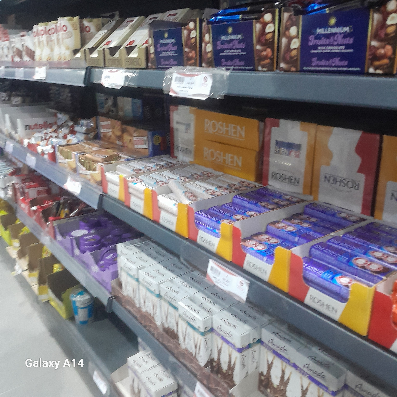The image shows a shelf in a store, likely a grocery store or supermarket, stocked with various chocolate and confectionery items. Brands visible include "MILLENNIUM," "ROSHEN," "Amada" and "Nutella"…read more