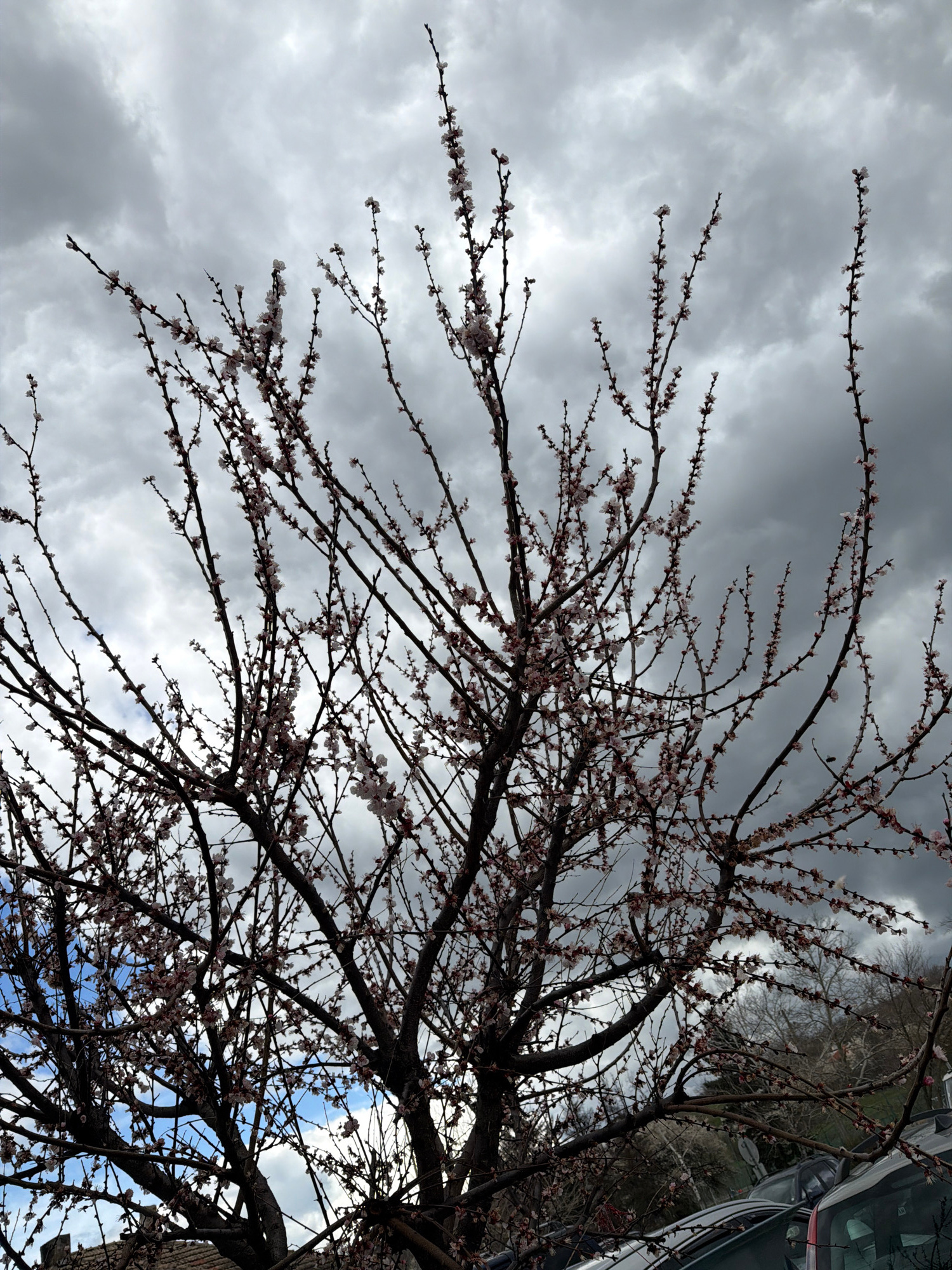 A medium shot shows a tree in bloom against a backdrop of overcast skies. The tree's bare branches are adorned with small, delicate blossoms, possibly peach or apricot. Patches of blue sky peek througβ¦read more
