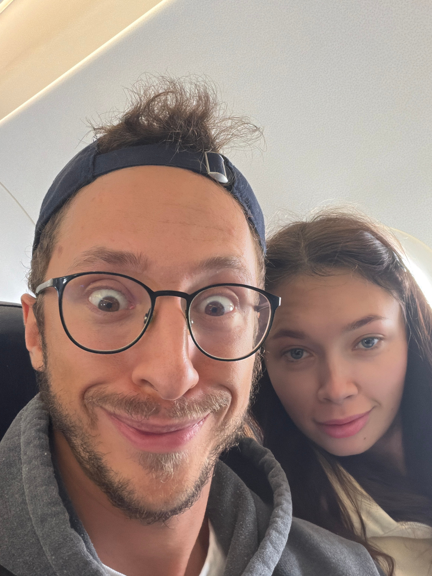 Two people, a man and a woman, are in the frame. The man is wearing glasses and a dark head covering, and has facial hair. He is looking directly at the camera with a slightly surprised expression. Th…read more