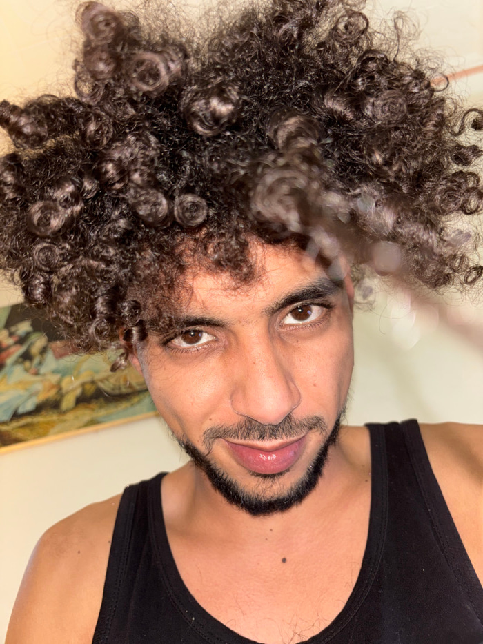 A man with curly, dark hair fills the frame, his face tilted towards the camera. He has brown eyes and a trimmed beard. He is wearing a black tank top. The background is a light wall, with a glimpse o…read more