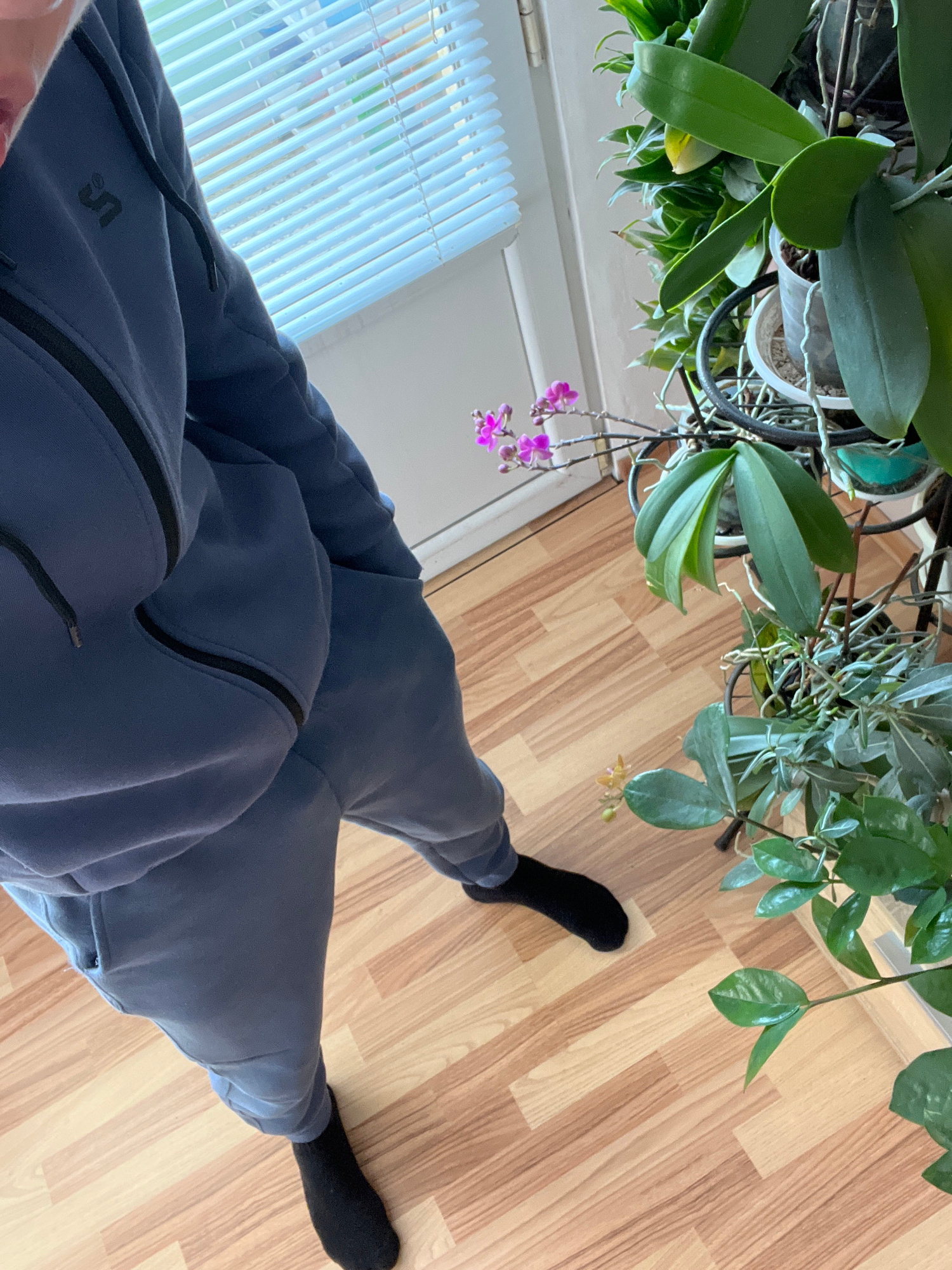 The image depicts a first-person, downward perspective of a person wearing a blue zippered jacket and sweatpants with black socks, standing on a light-colored wooden floor. Above the person are severa…read more