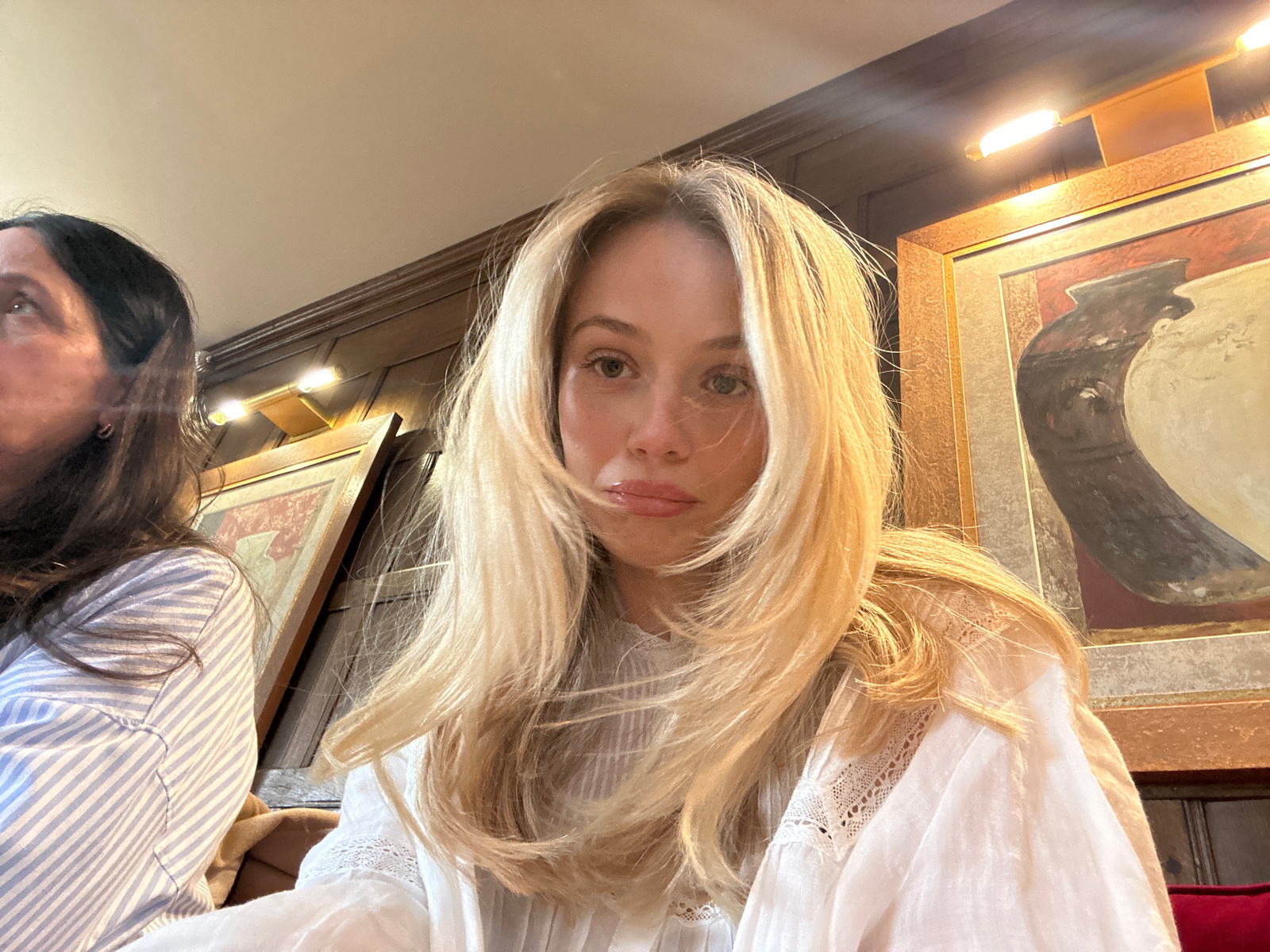 The image shows a close-up, upside-down view of two women sitting at a table in a restaurant setting. The first woman has long, blond hair and is wearing a white blouse with lace detailing. The second…read more