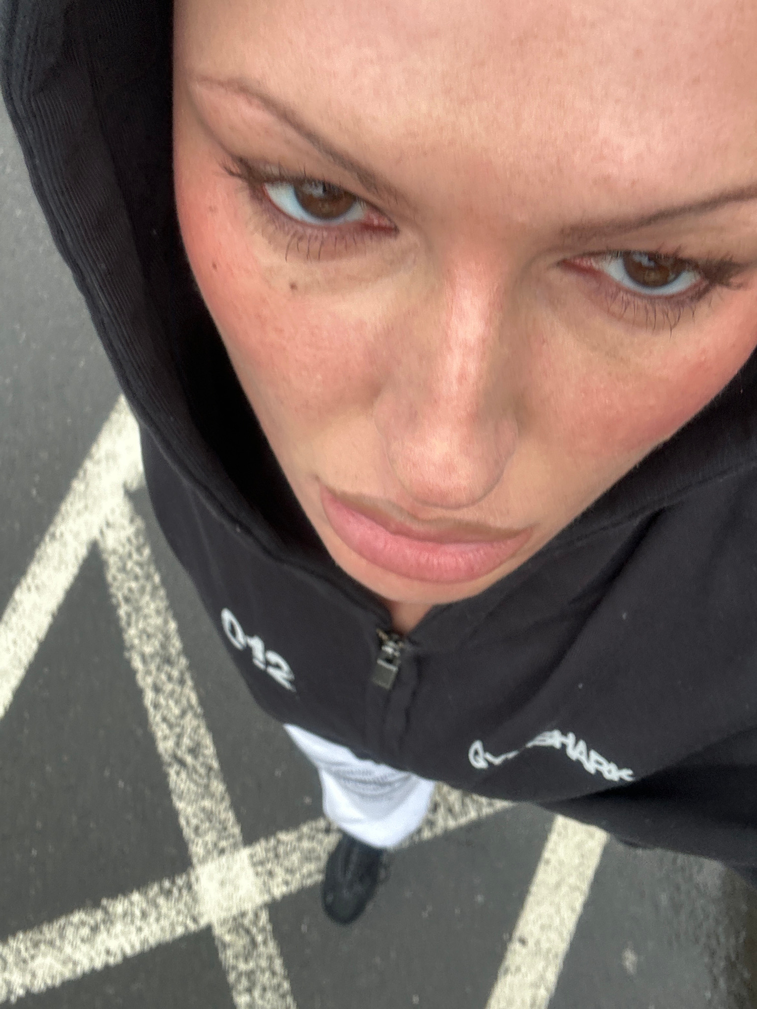 An individual, likely female, is photographed from a high-angle, downward perspective, standing on an asphalt surface. The subject's face features fair skin with some freckles and a reddish complexion…read more