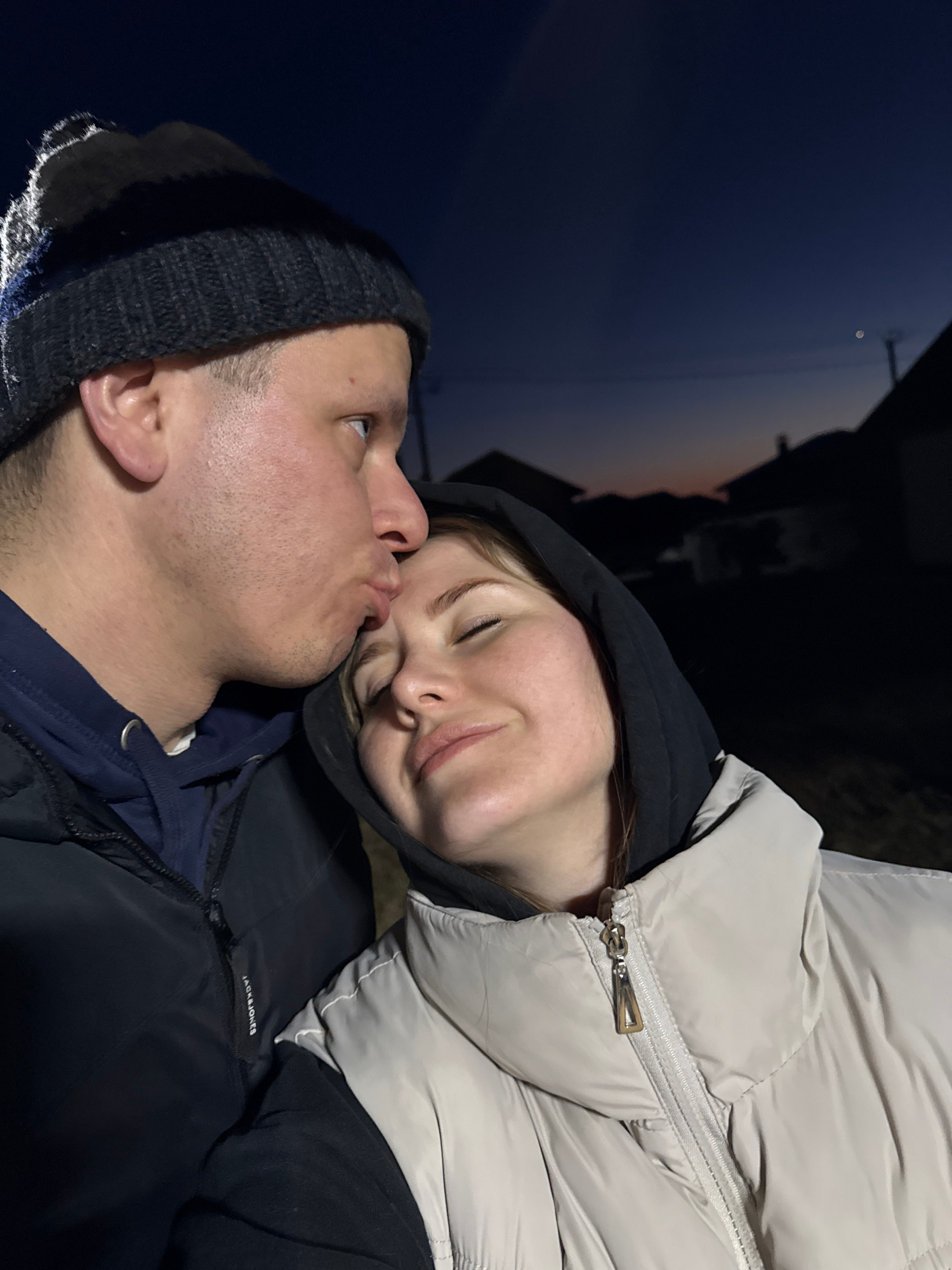A couple is captured in a close-up, seemingly affectionate pose outdoors. The man, wearing a black knit hat, is positioned with his face looking upwards, while the woman, dressed in a light-colored, p…read more