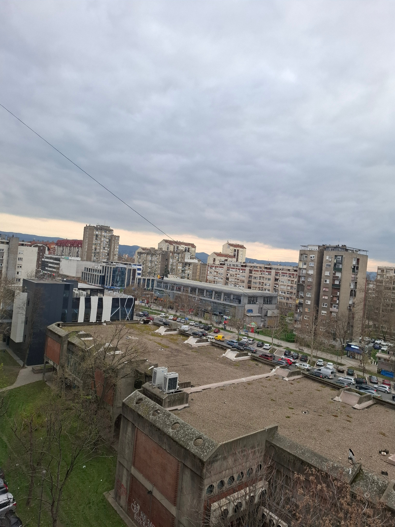 The image captures a view over Novi Sad, Serbia, with a perspective overlooking buildings, streets, and parking areas. The scene is characterized by overcast skies, providing muted light across the ur…read more