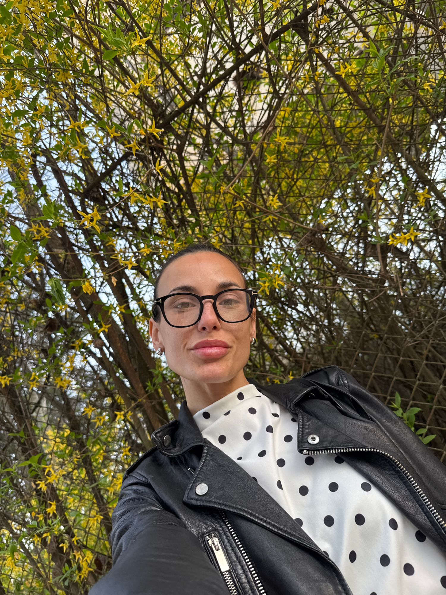 A woman with black-rimmed glasses and a black leather jacket over a white polka-dot blouse is standing outdoors in front of a bush with yellow flowers. The background appears to be a wire fence. The p…read more