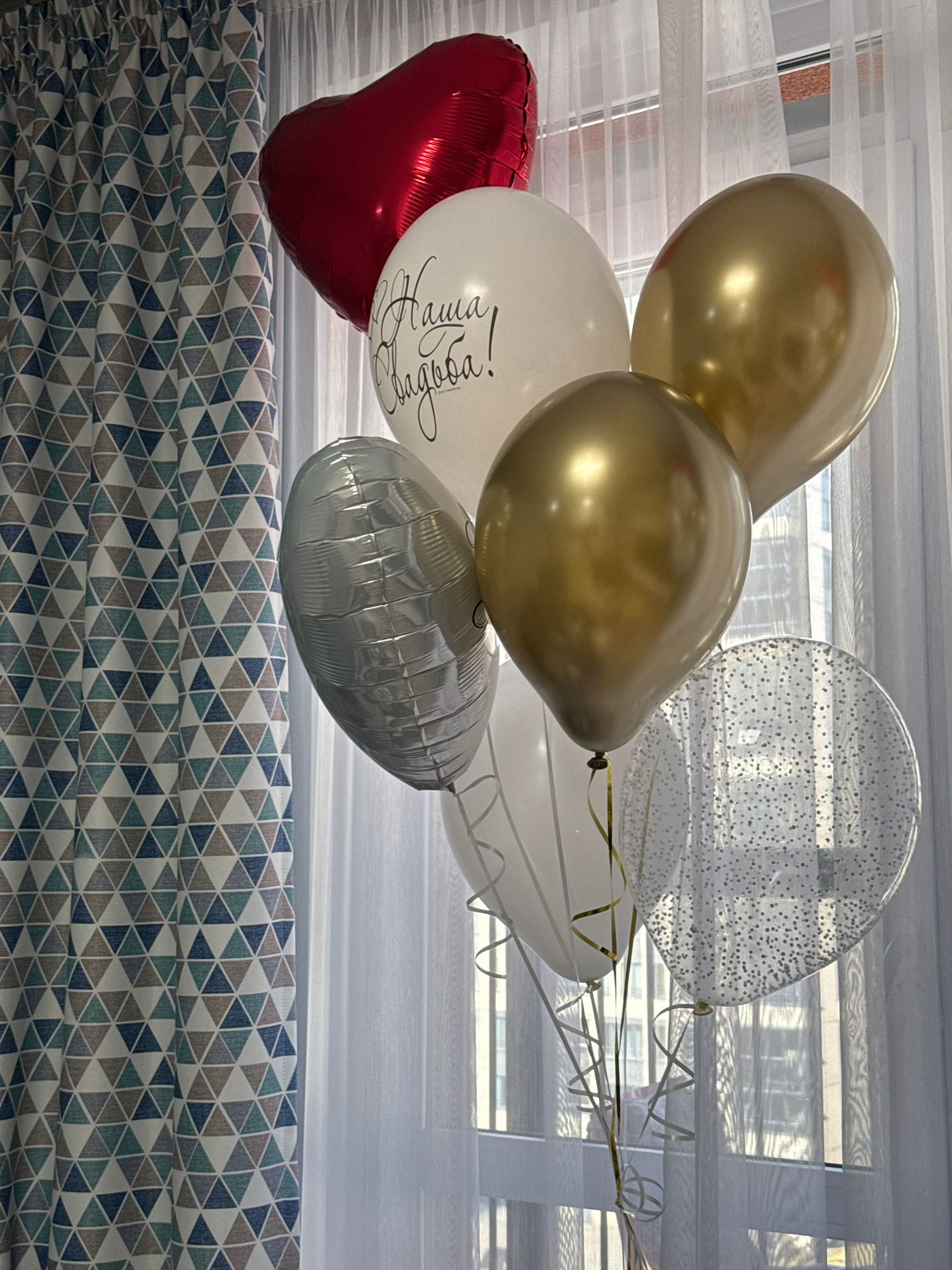 A cluster of helium balloons floats indoors, likely near a window, suggesting a celebratory occasion. The arrangement includes two metallic gold oval balloons, one clear balloon filled with small silv…read more
