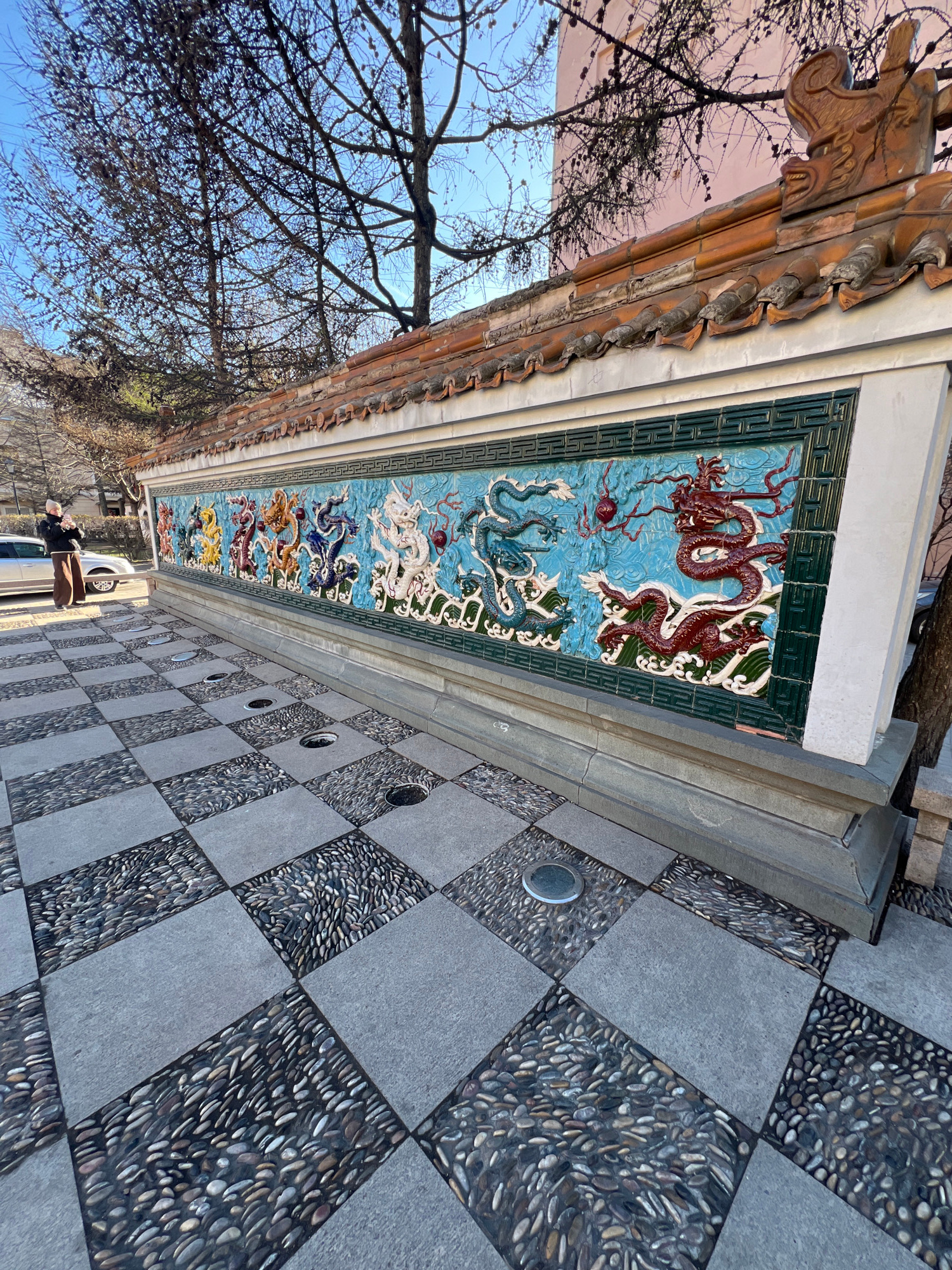 The vertically oriented image displays a detailed architectural feature alongside a patterned ground, beneath a clear blue sky. A long, ornate wall with a traditional East Asian roofline runs across t…read more