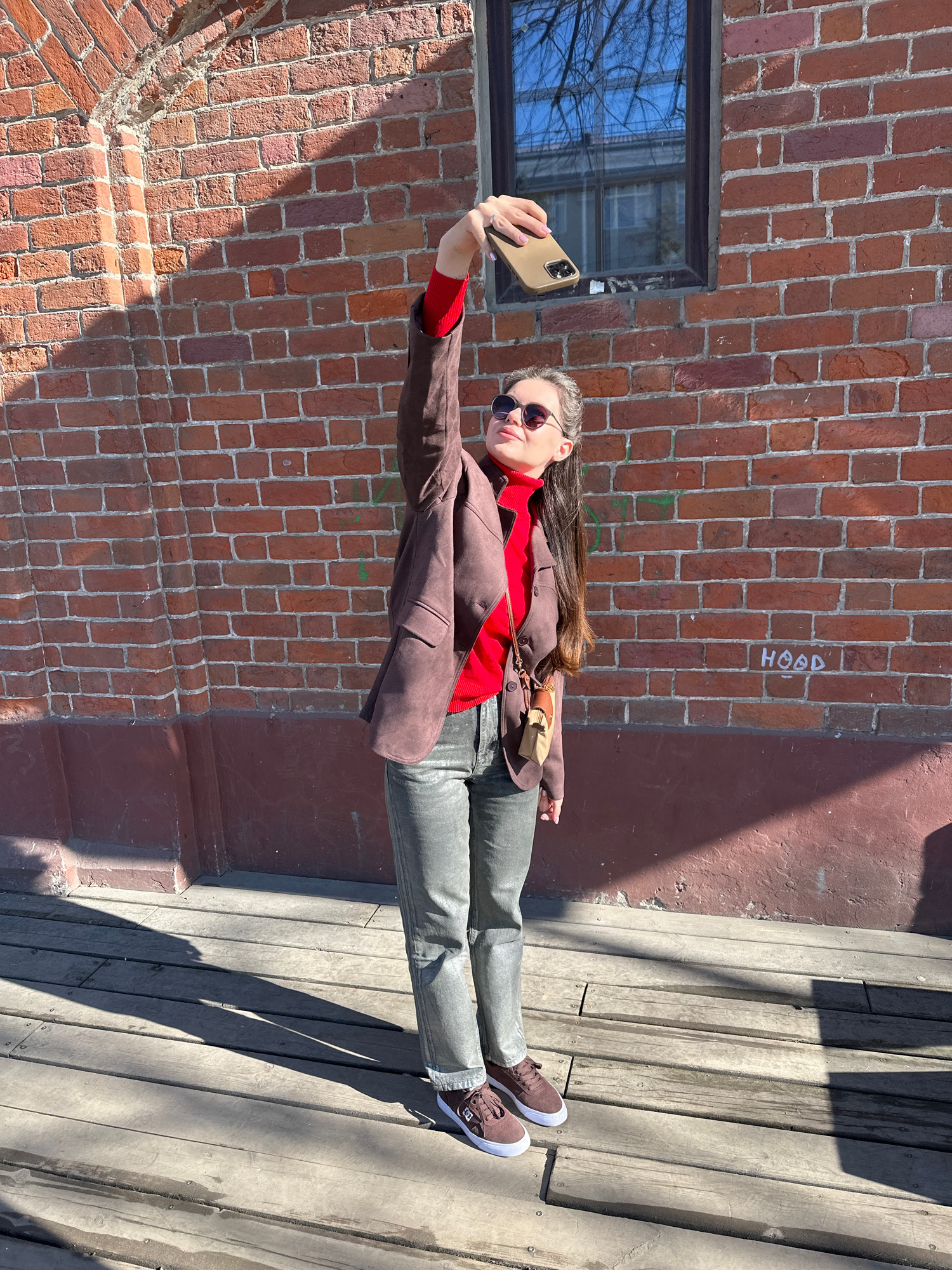 A person is standing outdoors, posing for a selfie against a brick wall and a wooden structure that appears to be stairs. The person is wearing sunglasses, a red turtleneck, a brown jacket, and gray p…read more
