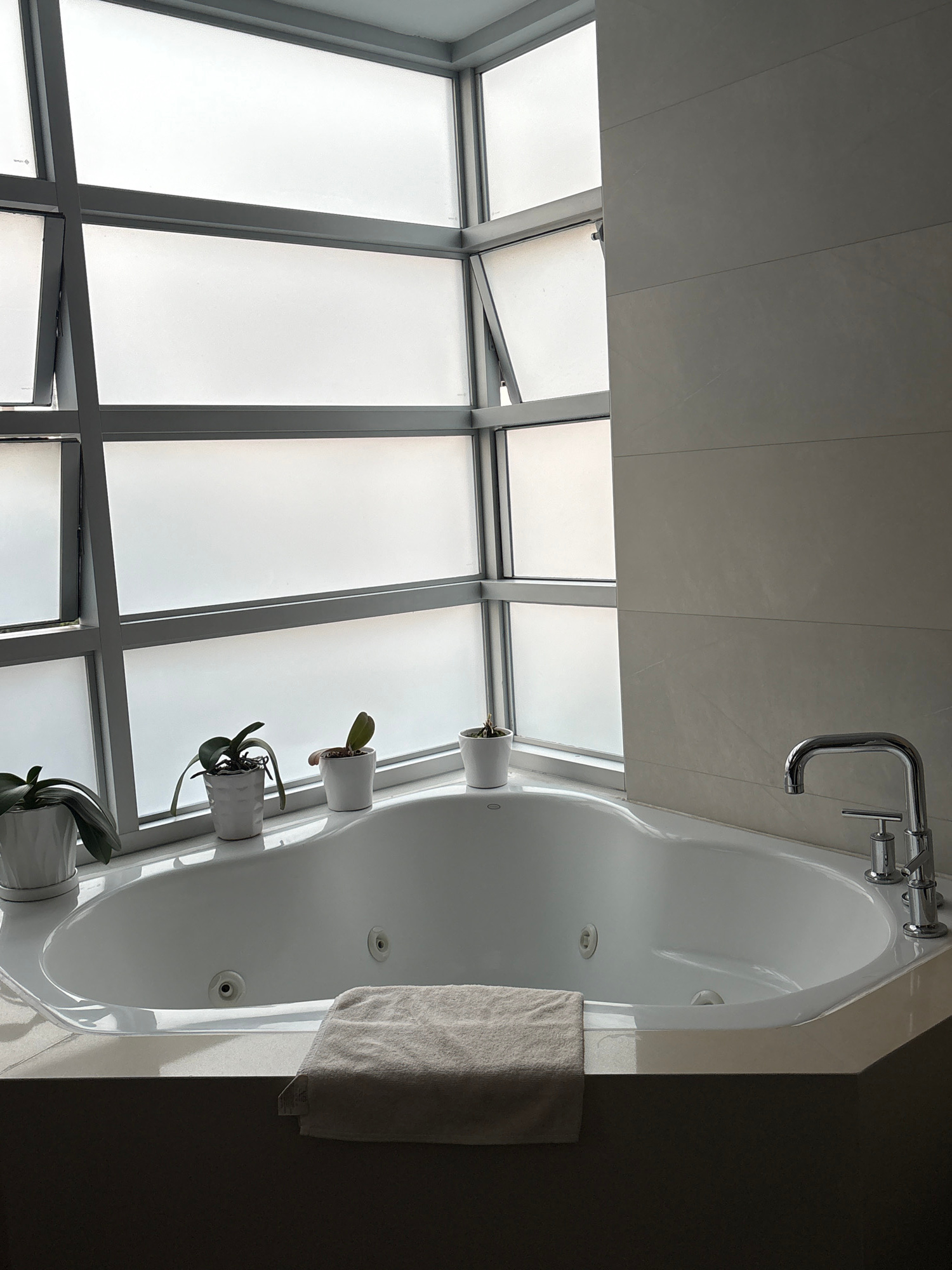 The image presents a bright, modern bathroom interior. A white oval bathtub is the primary subject, positioned near a large window composed of numerous frosted glass panes and black metal frames. A si…read more