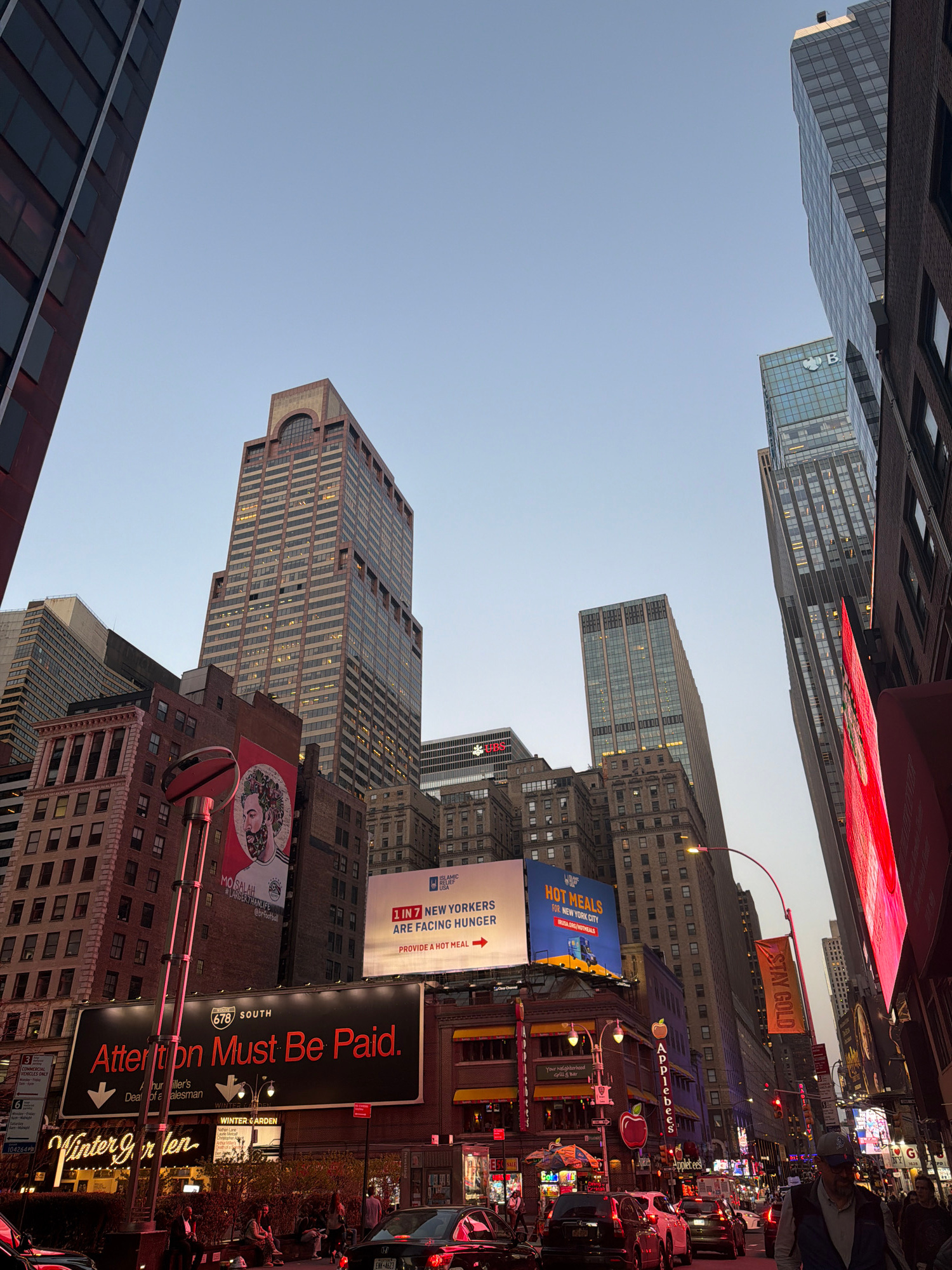 The image shows a street in New York City, USA. Tall buildings surround the street, some made of brick and some of glass. Billboards are prominent, including one that reads "Attention Must Be Paid" an…read more