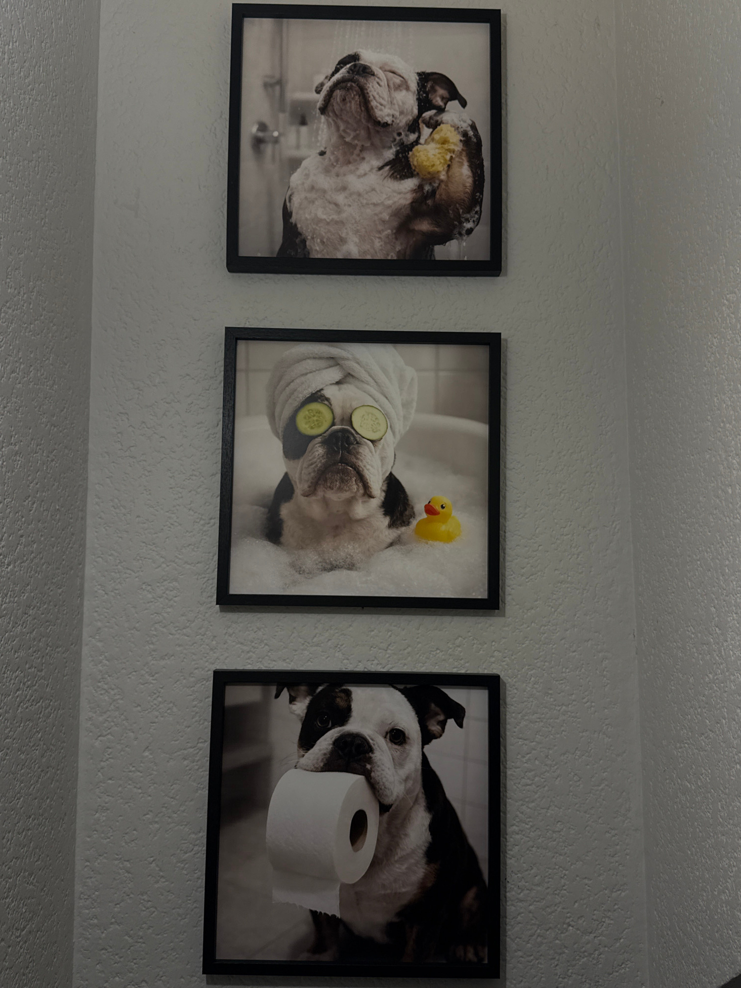 The image shows three framed photos on a wall with a textured surface. The frames are black. The photos appear to be humorous depictions of dogs in bathroom situations. On the left, a dog has yellow gā¦read more