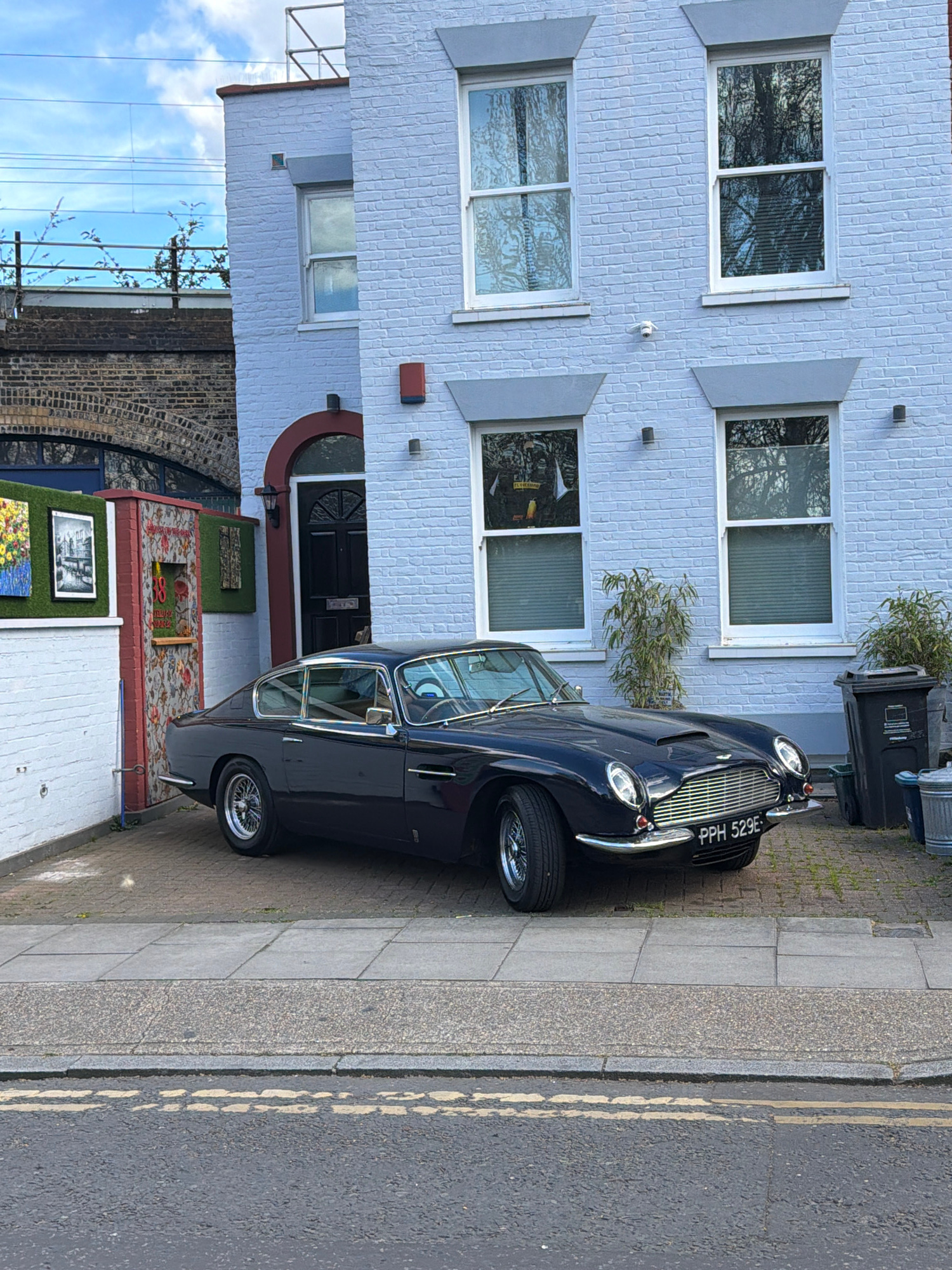 The image captures a scene on a street in London, United Kingdom. A dark blue vintage car, registration number PPH 529E, is parked along the curb next to a light blue brick building with white-framed…read more