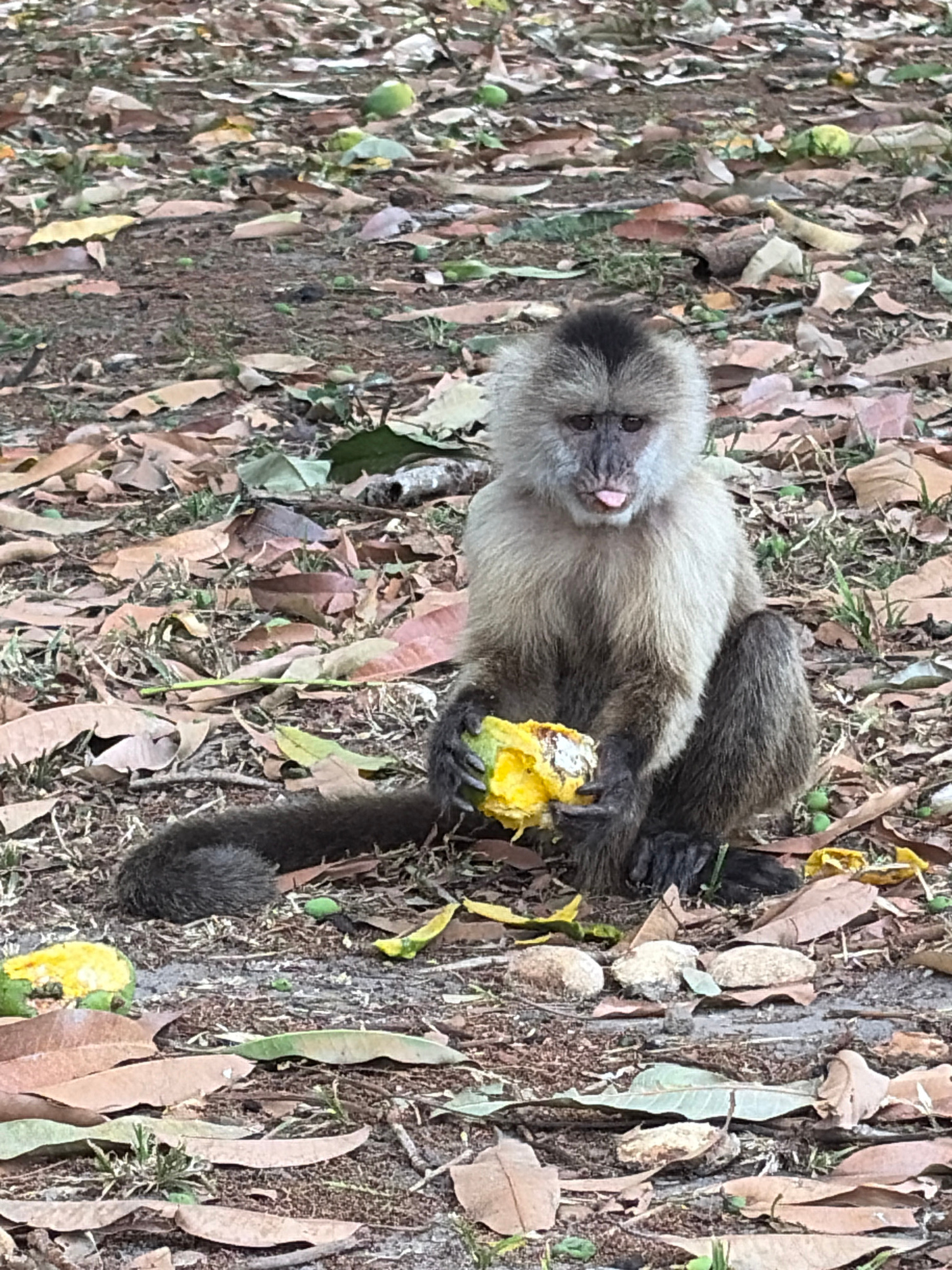 The image shows a monkey with a beige chest and a darker face, holding a partially eaten yellow fruit, possibly a mango, in its hands. The monkey's tongue is slightly visible. The background consists…read more