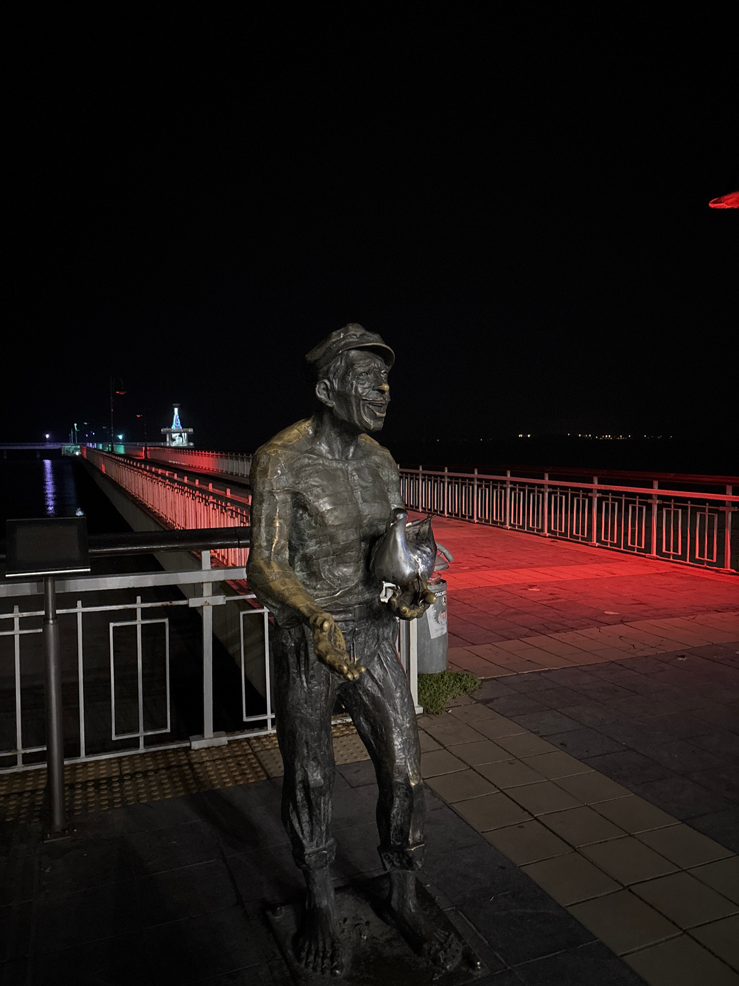 The image shows a bronze statue of a fisherman mending nets at night in Burgas, Bulgaria. The statue is positioned on a walkway near a bridge. The area is illuminated by red and blue lights reflecting…read more